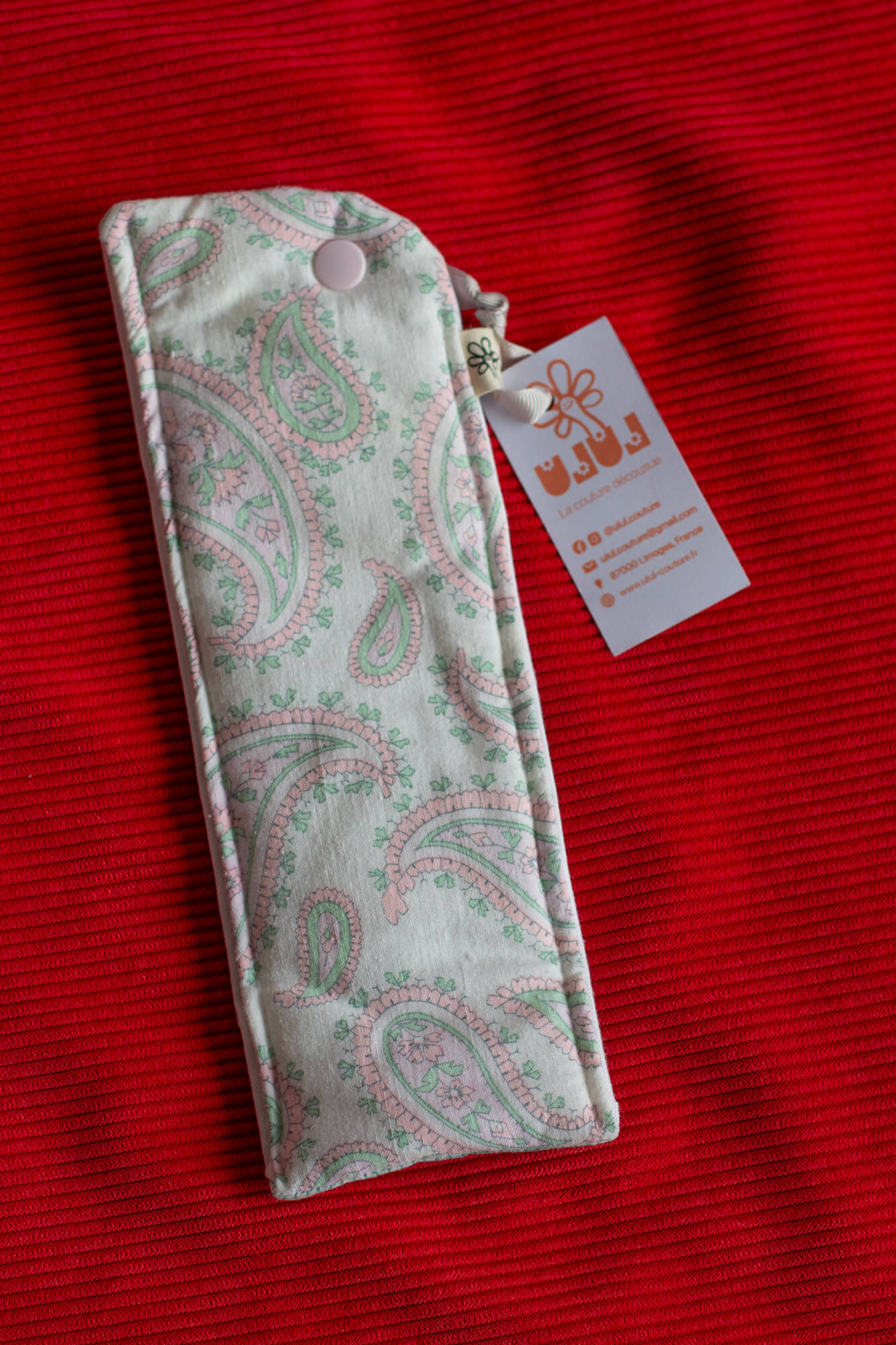 De base, réalisé en qu'étui à lunettes à partir de tissus recyclés (une taie de traversin et une jupe), je me suis trompée sur les mesures, ce qui fait un étui assez long (24cm de longueur). Il peut donc être utilisé pour étui à lunettes, où étui à baguettes / couverts.