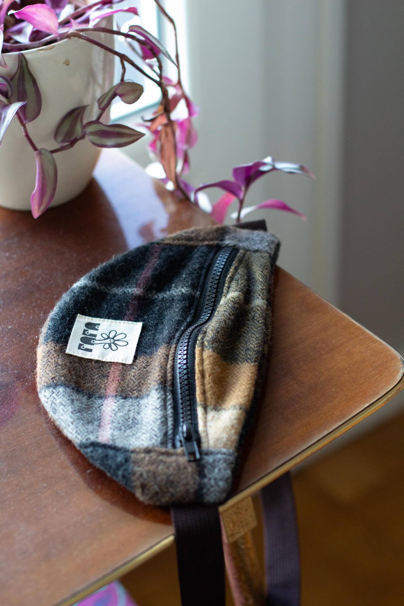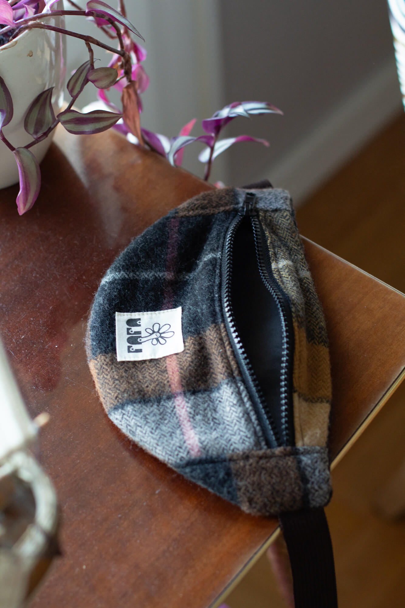 Sac baby banane hiver. Tissu extérieur marron à carreaux, intérieur gris foncé uni.