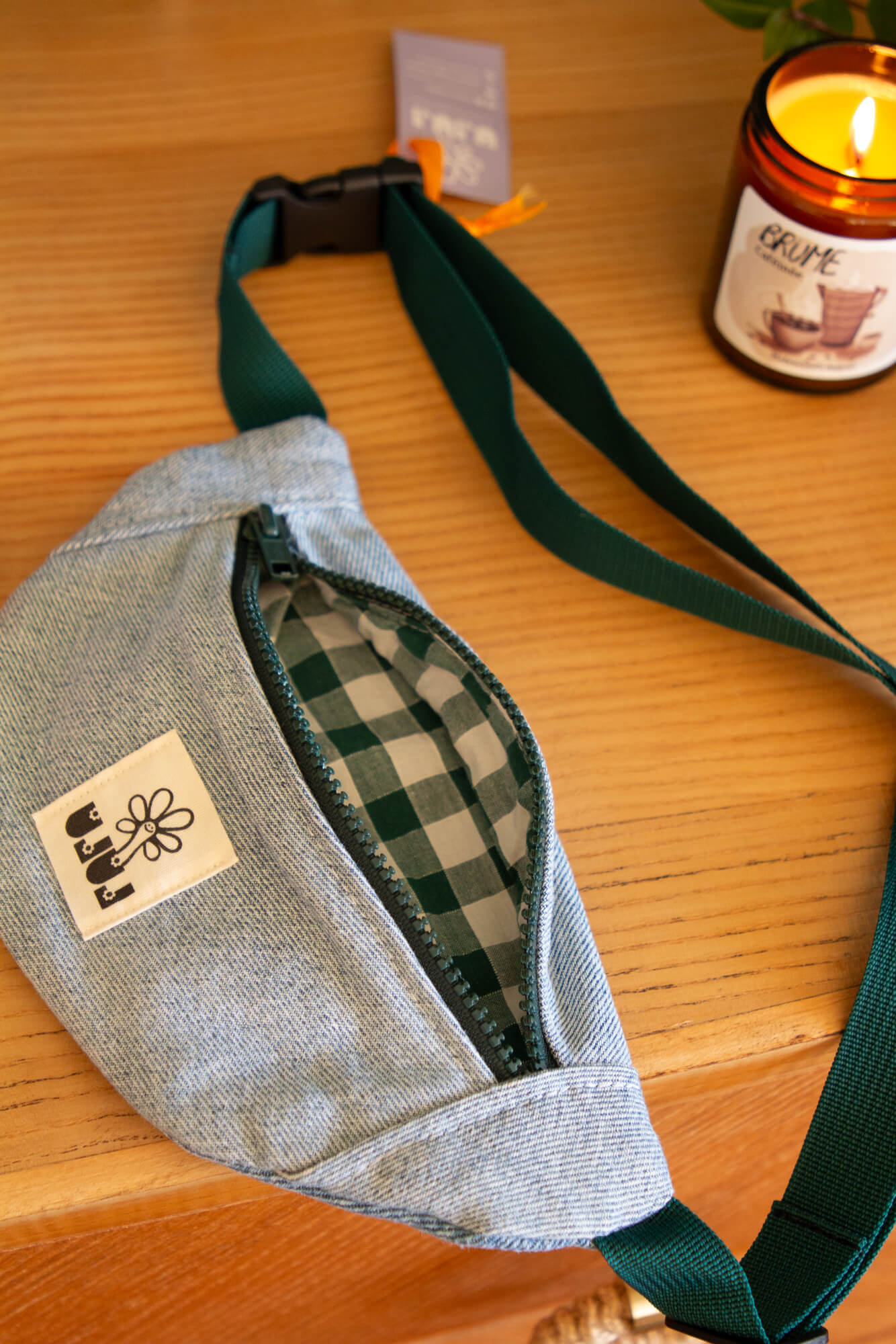 Sac baby banane jean. Tissu extérieur en jean, intérieur à carreaux vichy.
