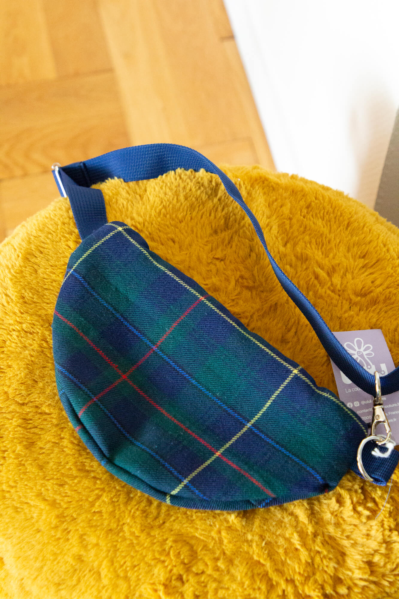 Sac baby banane tartan à carreaux bleu. Tissu extérieur tartan, intérieur gris foncé uni.