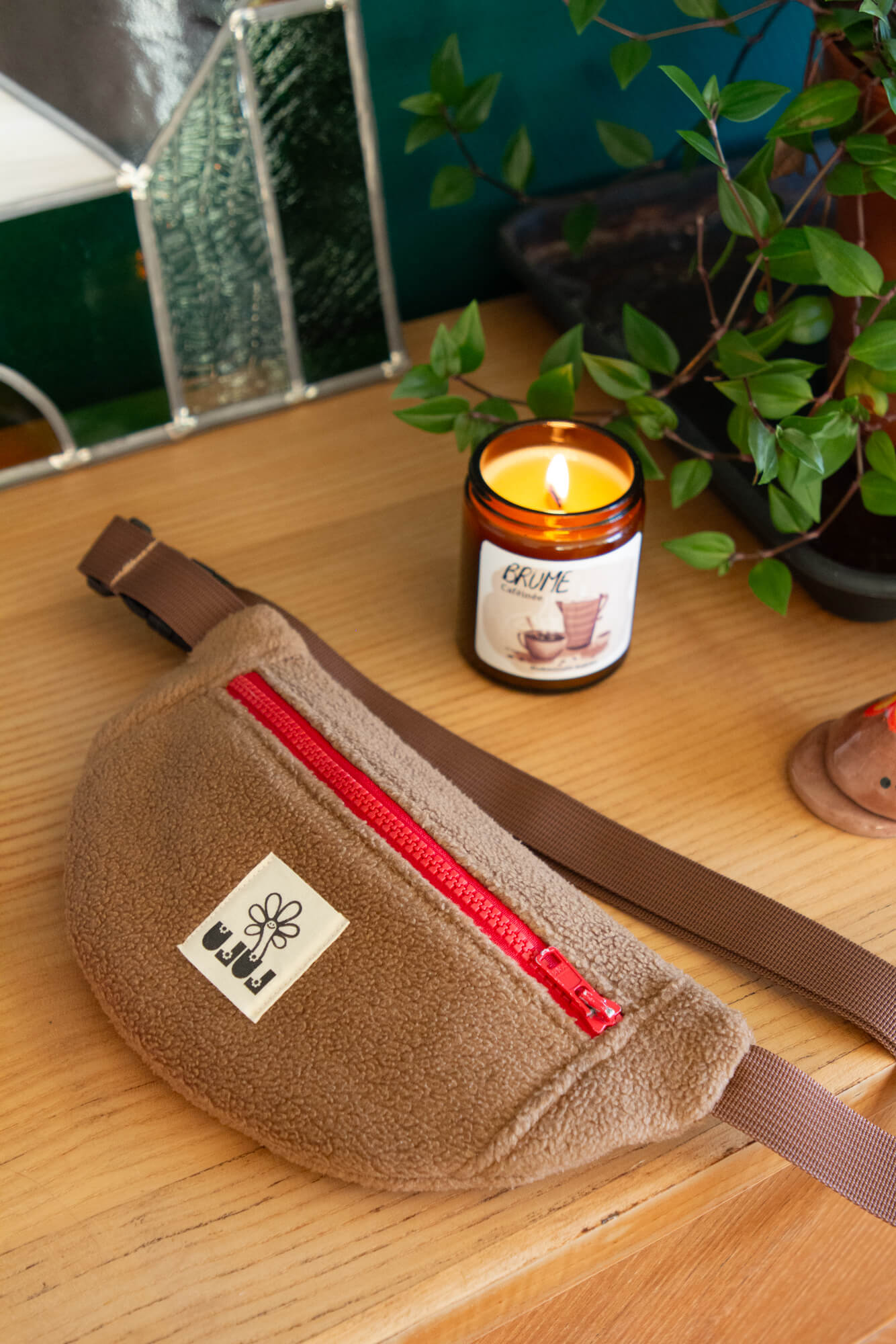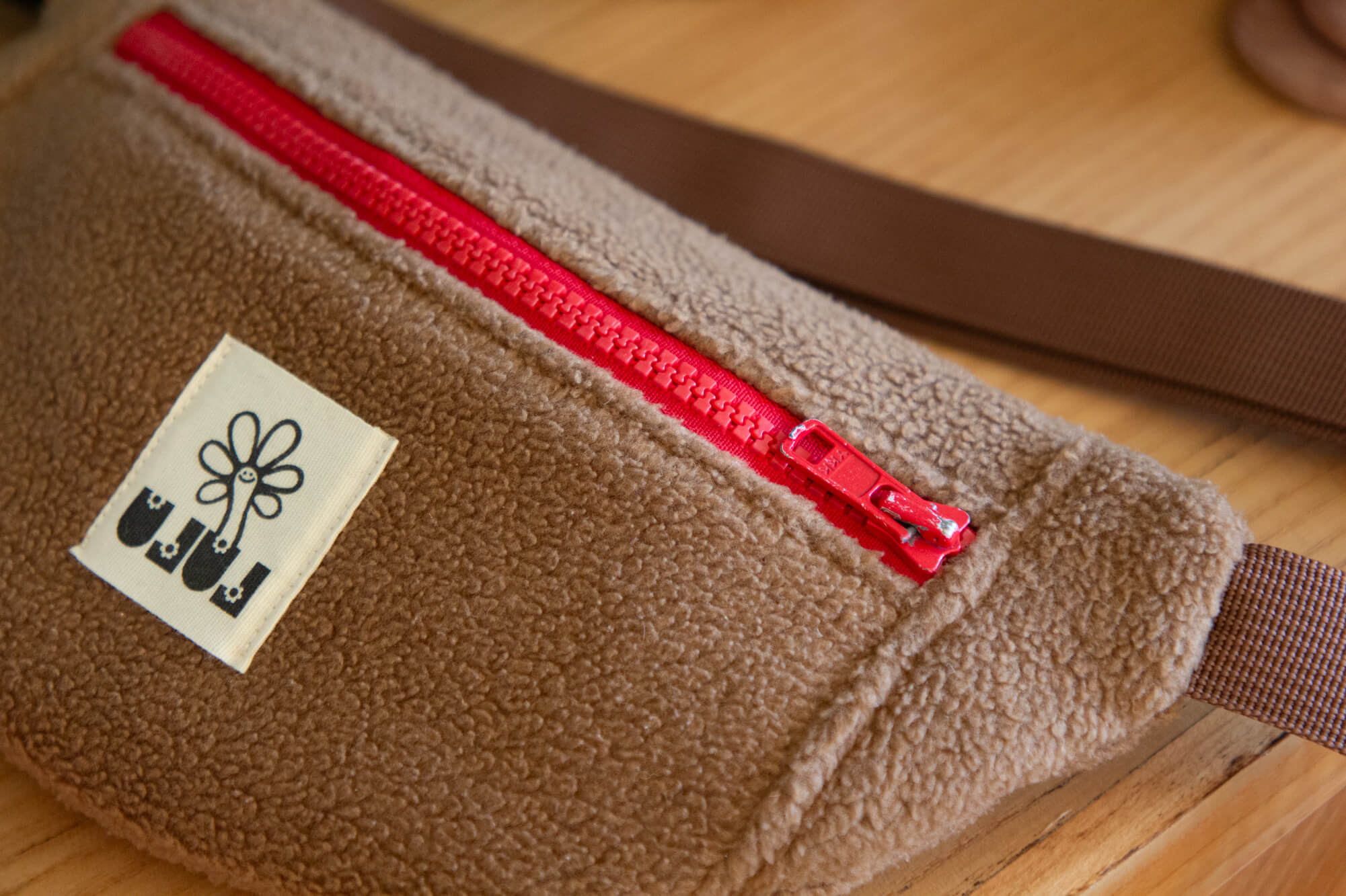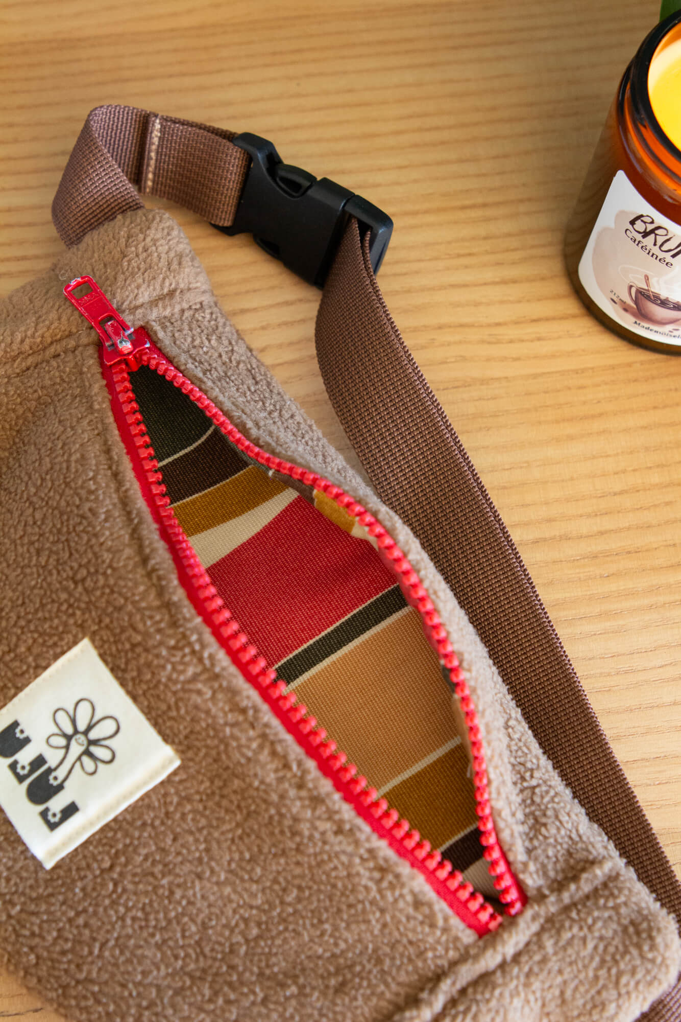 Sac baby banane Teddy. Tissu extérieur polaire marron, intérieur à courbes.