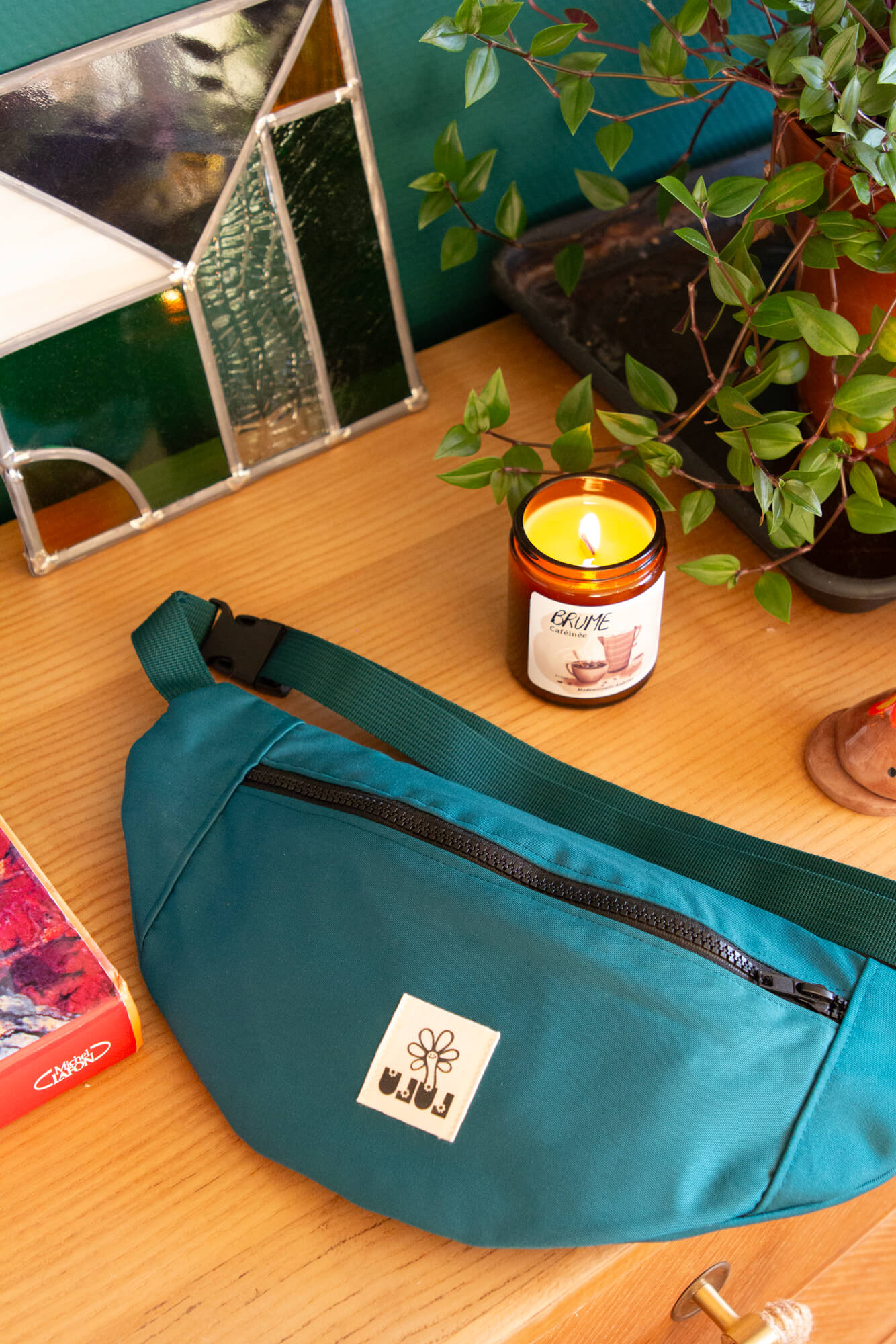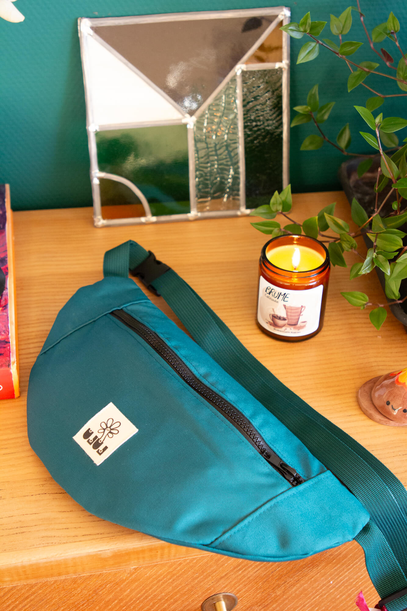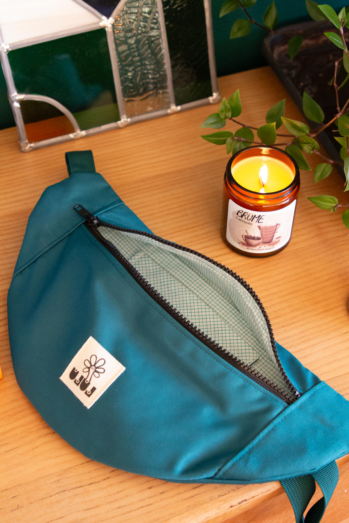 Sac banane émeraude. Tissu extérieur vert émeraude uni, intérieur à petits carreaux verts et blancs. Petite poche intérieure.