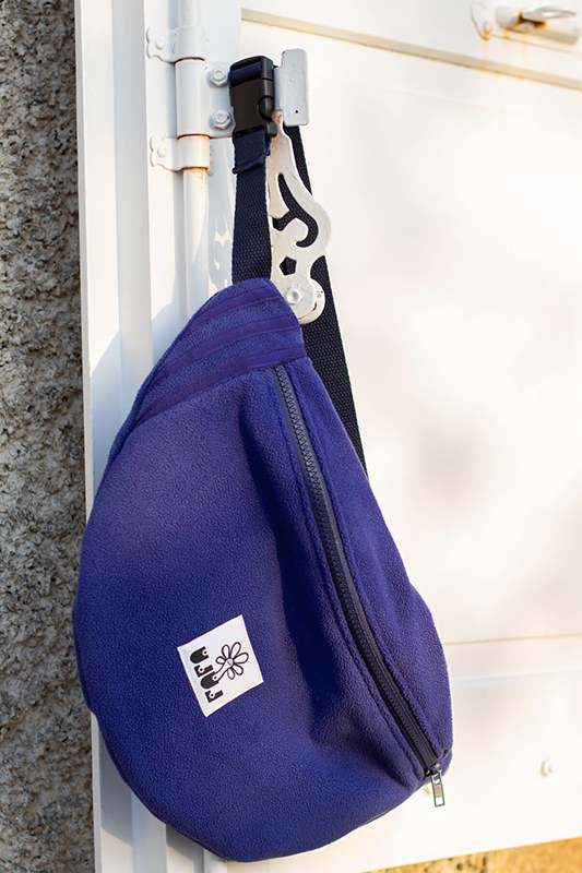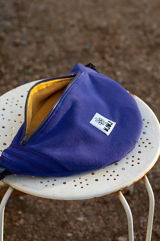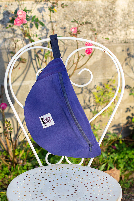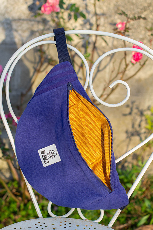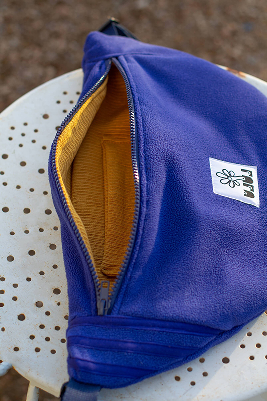 Sac banane polaire bleu électrique en grand modèle. Tissu extérieur polaire bleu électrique, intérieur jaune. Petite poche intérieure.