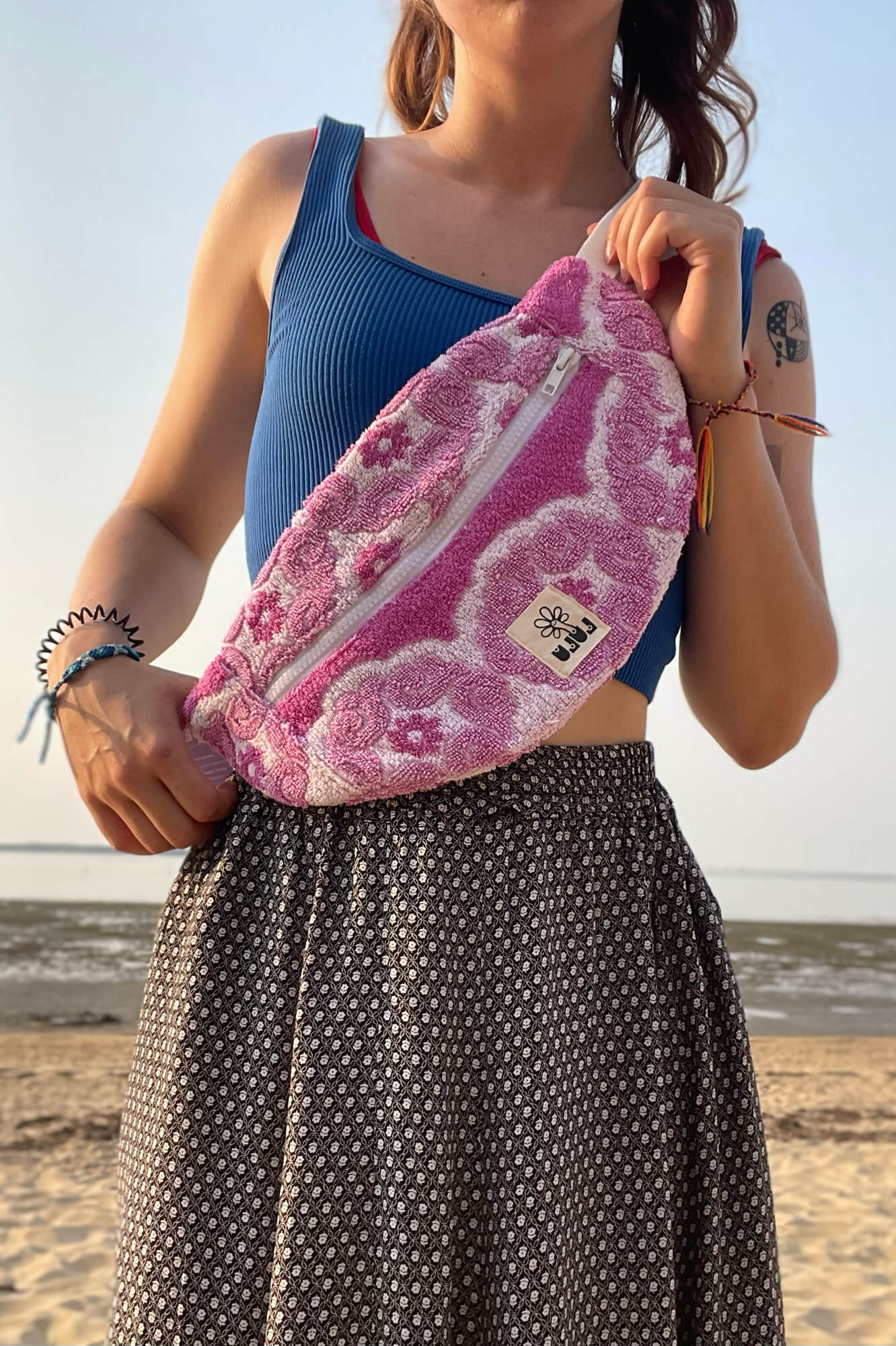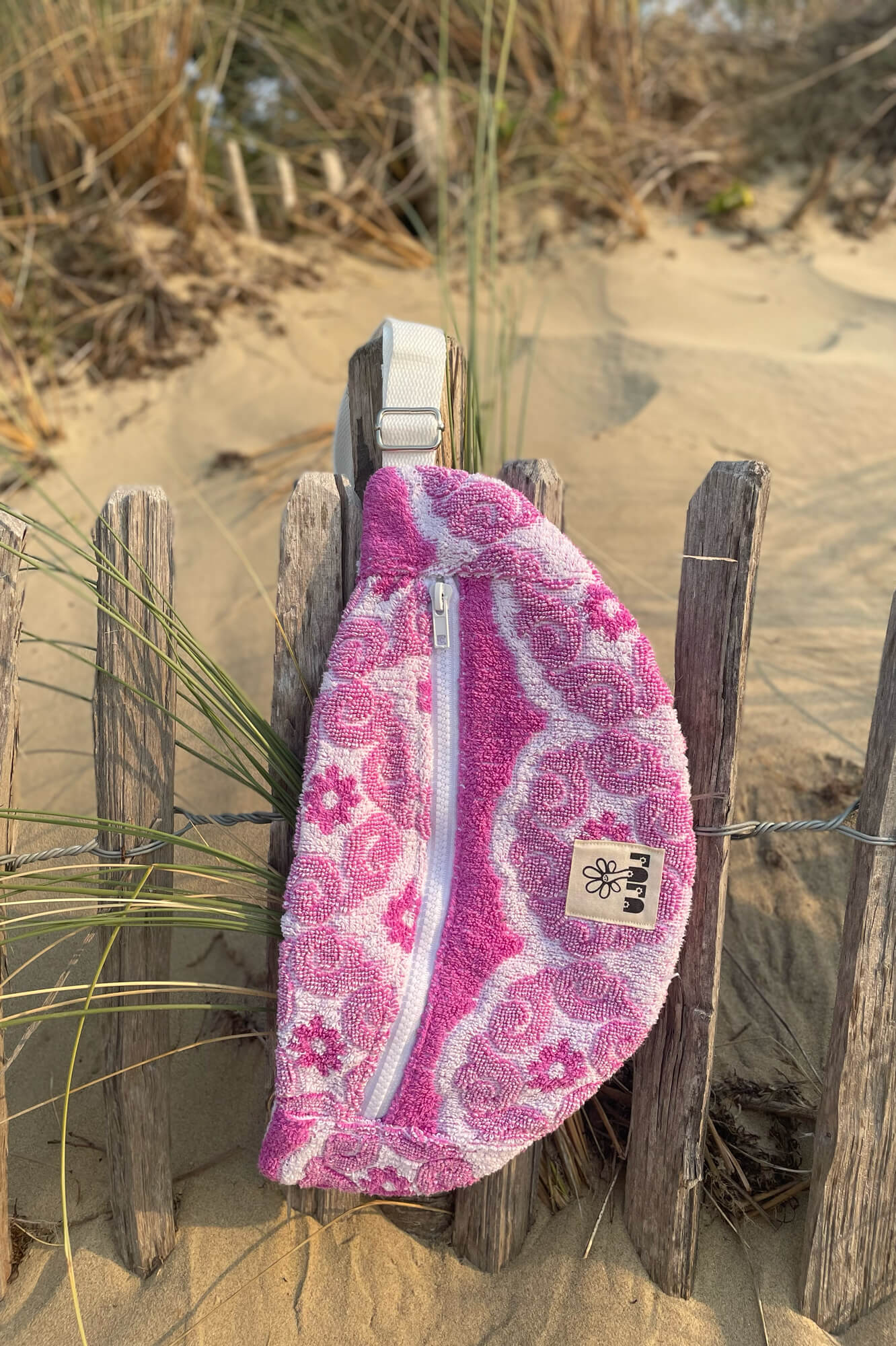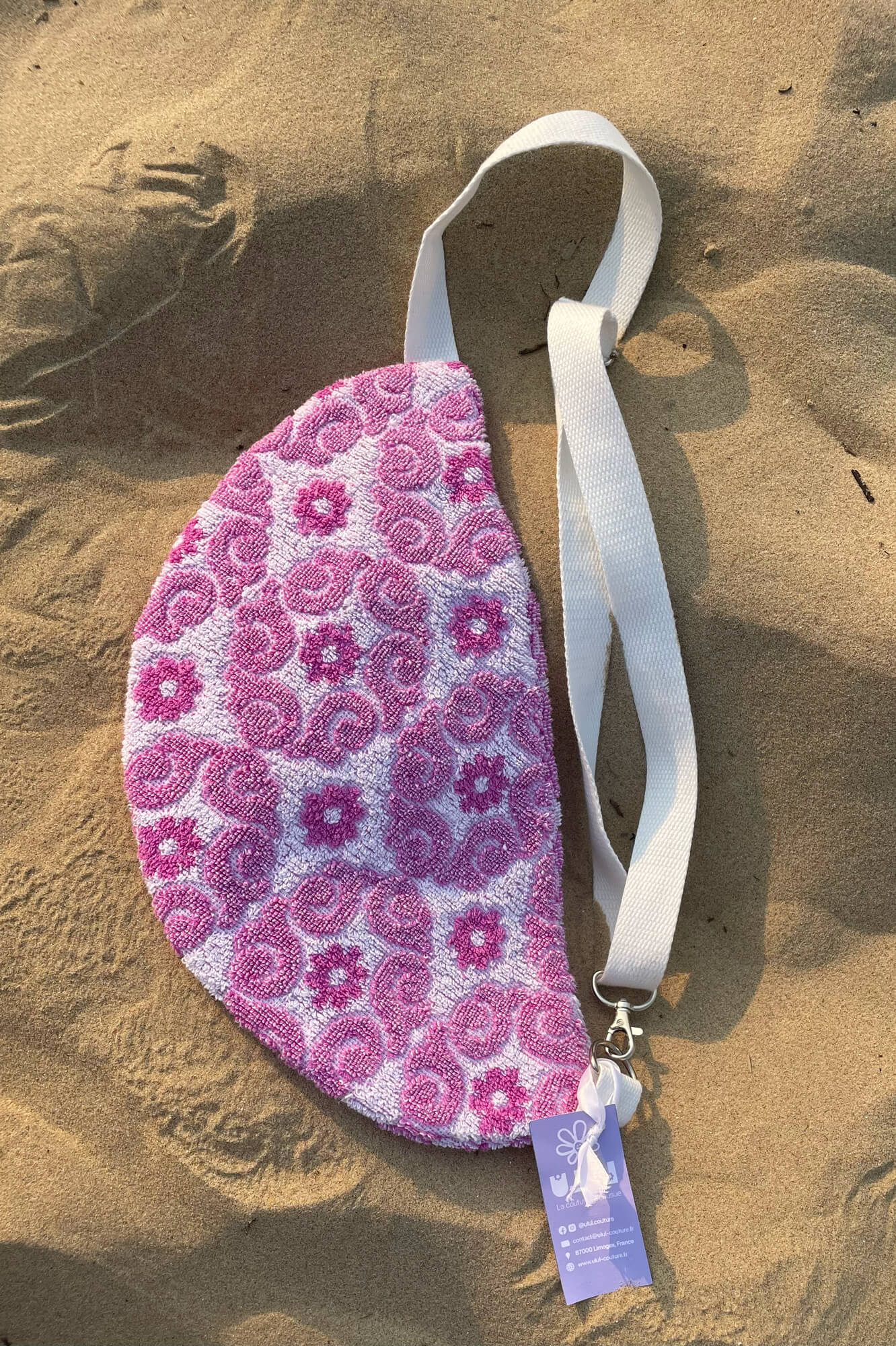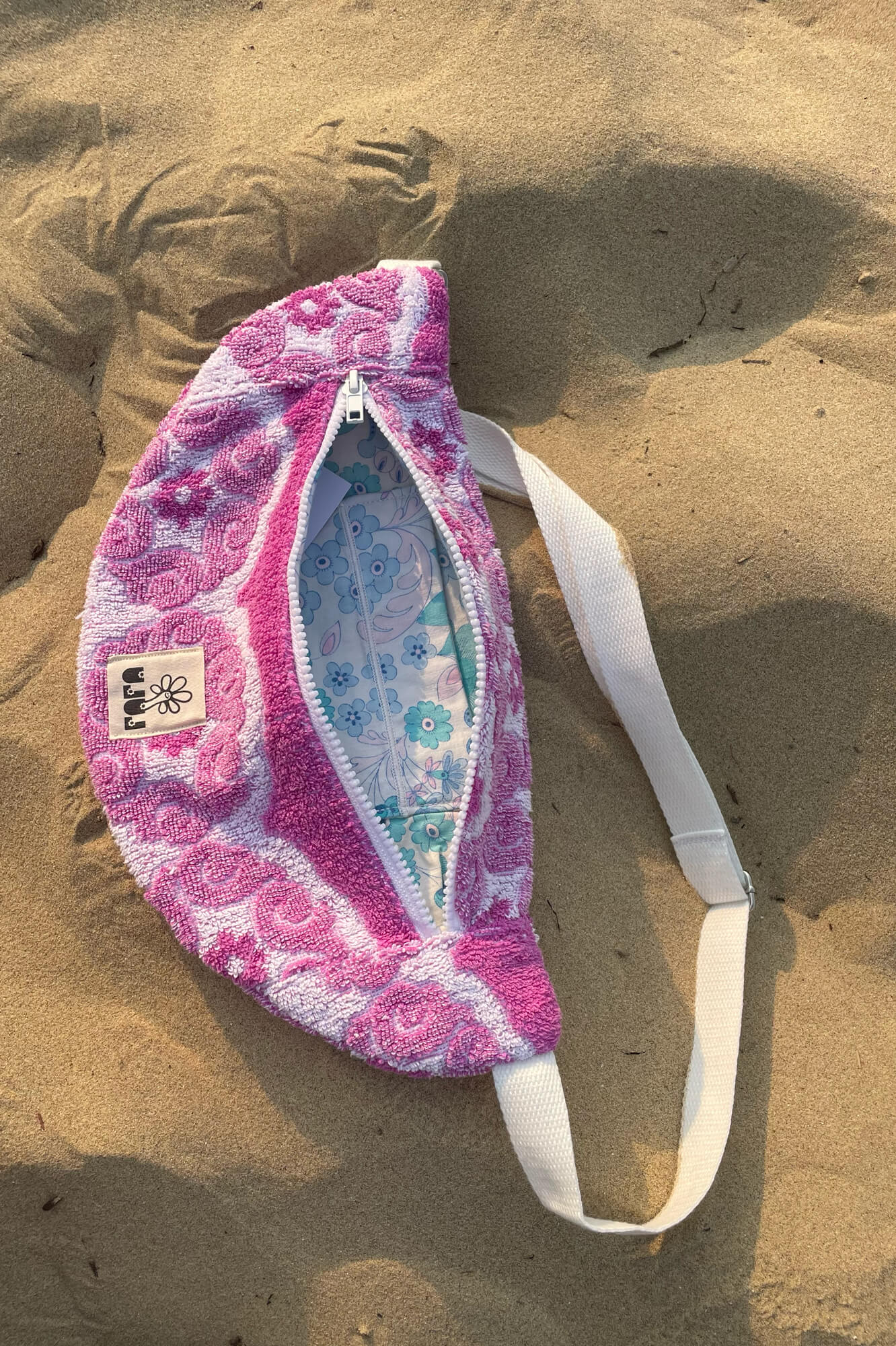 Sac banane retour de plage violette. Tissus extérieur serviette éponge à fleurs, intérieur flora bleu turquoise. Petite poche intérieure.