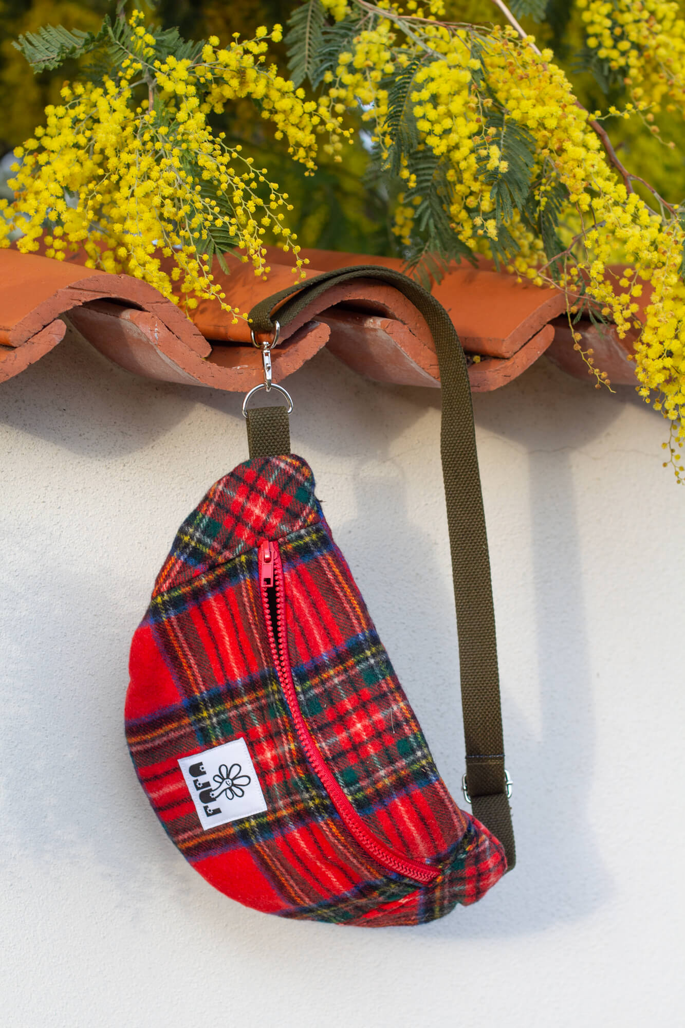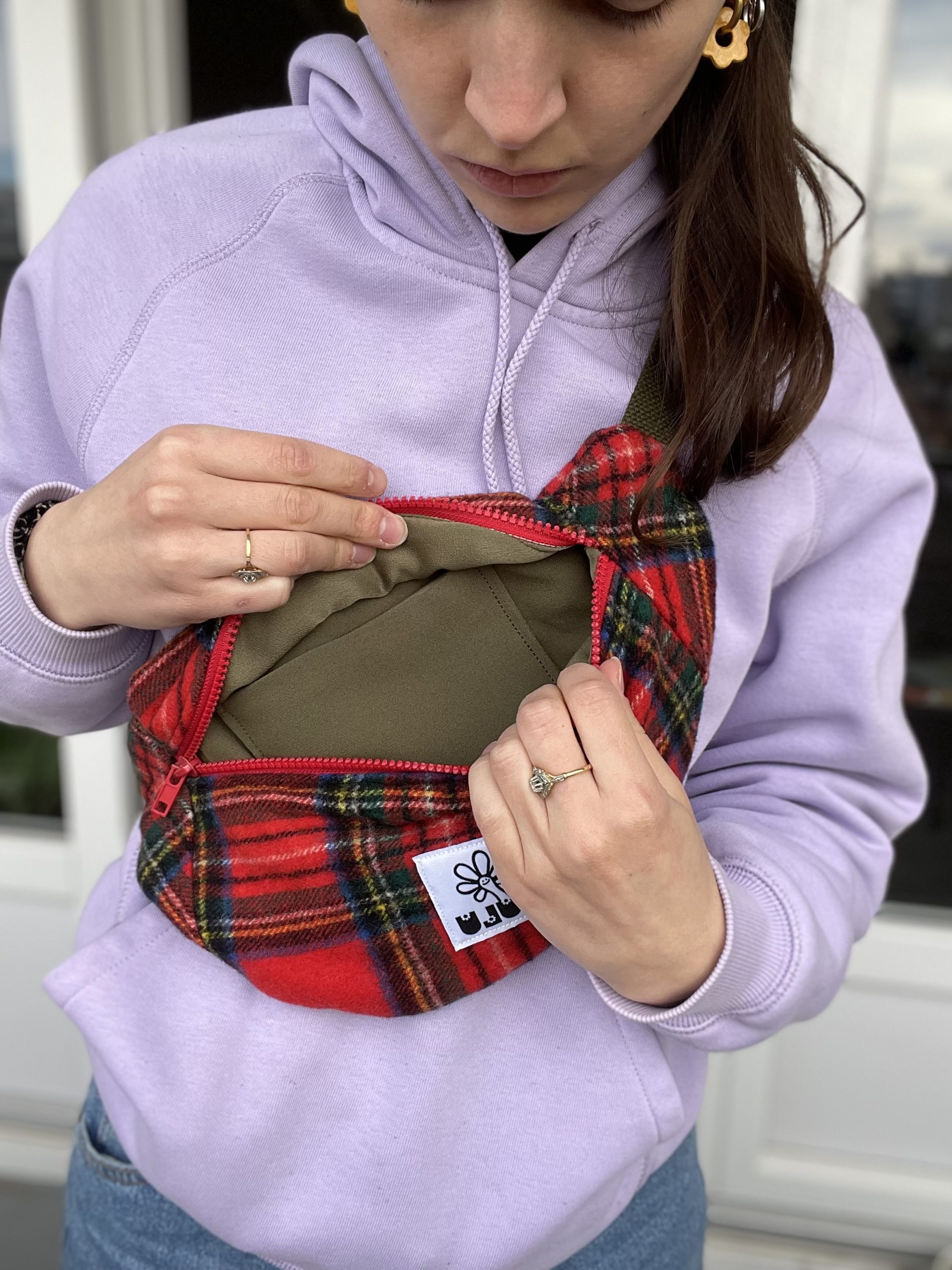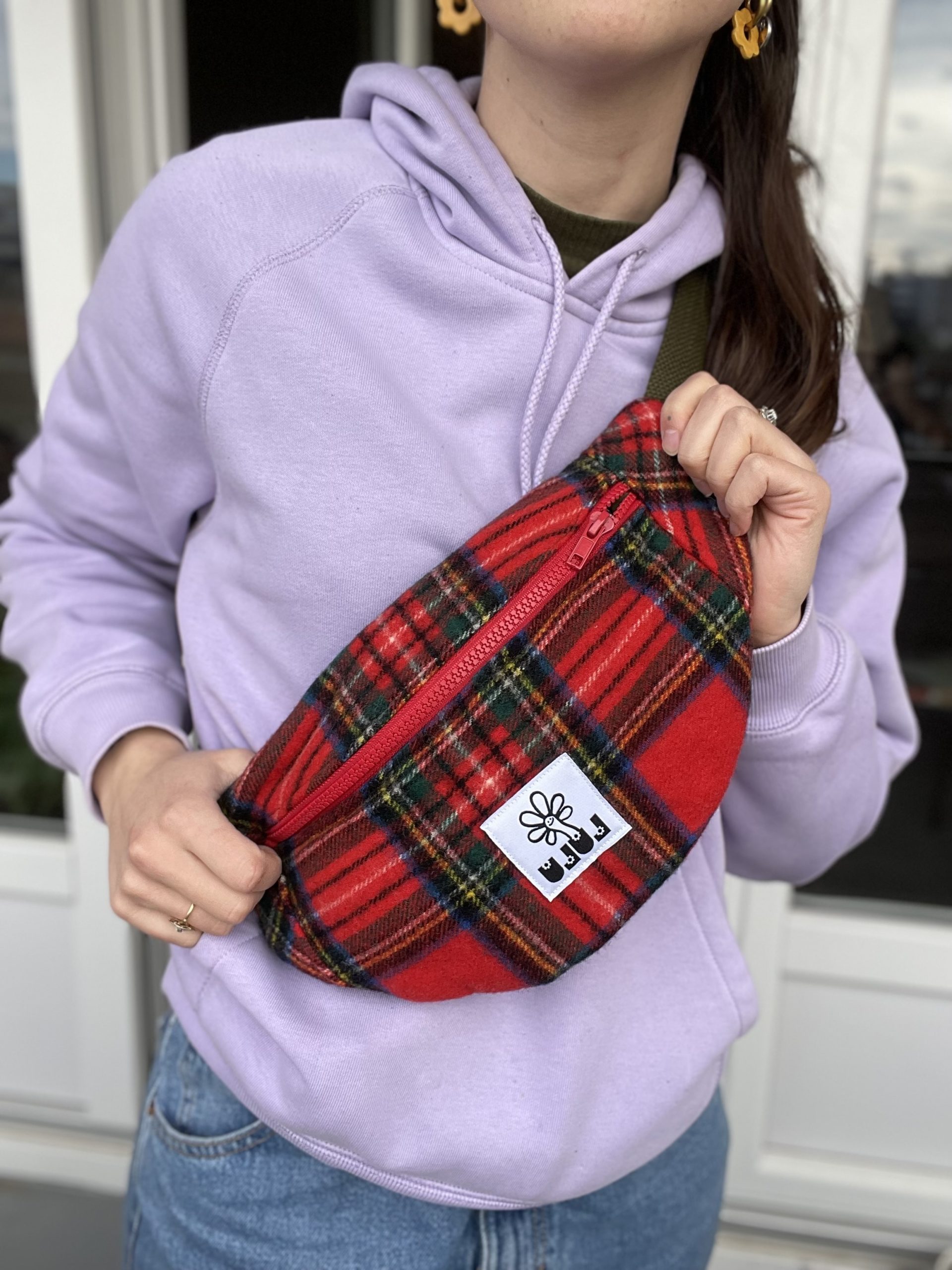 Sac banane tartan écossais rouge en modèle basique. Tissu extérieur en laine, intérieur kaki satiné. Petite poche intérieure.