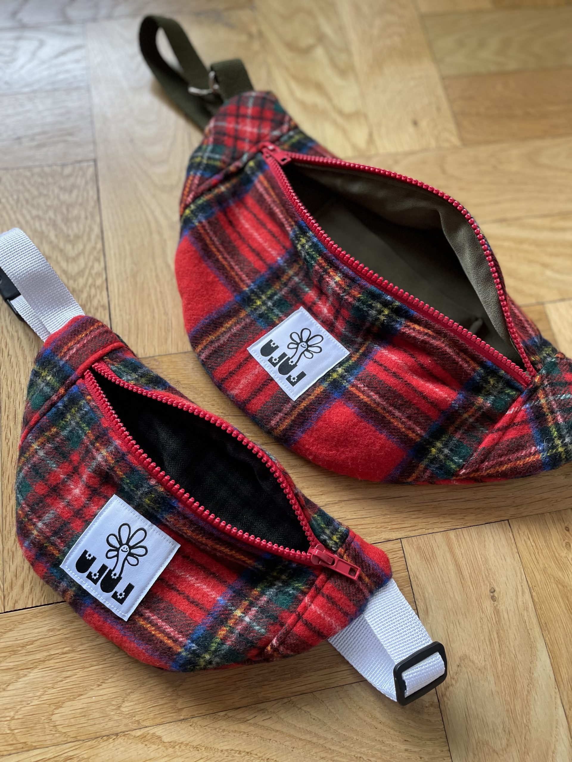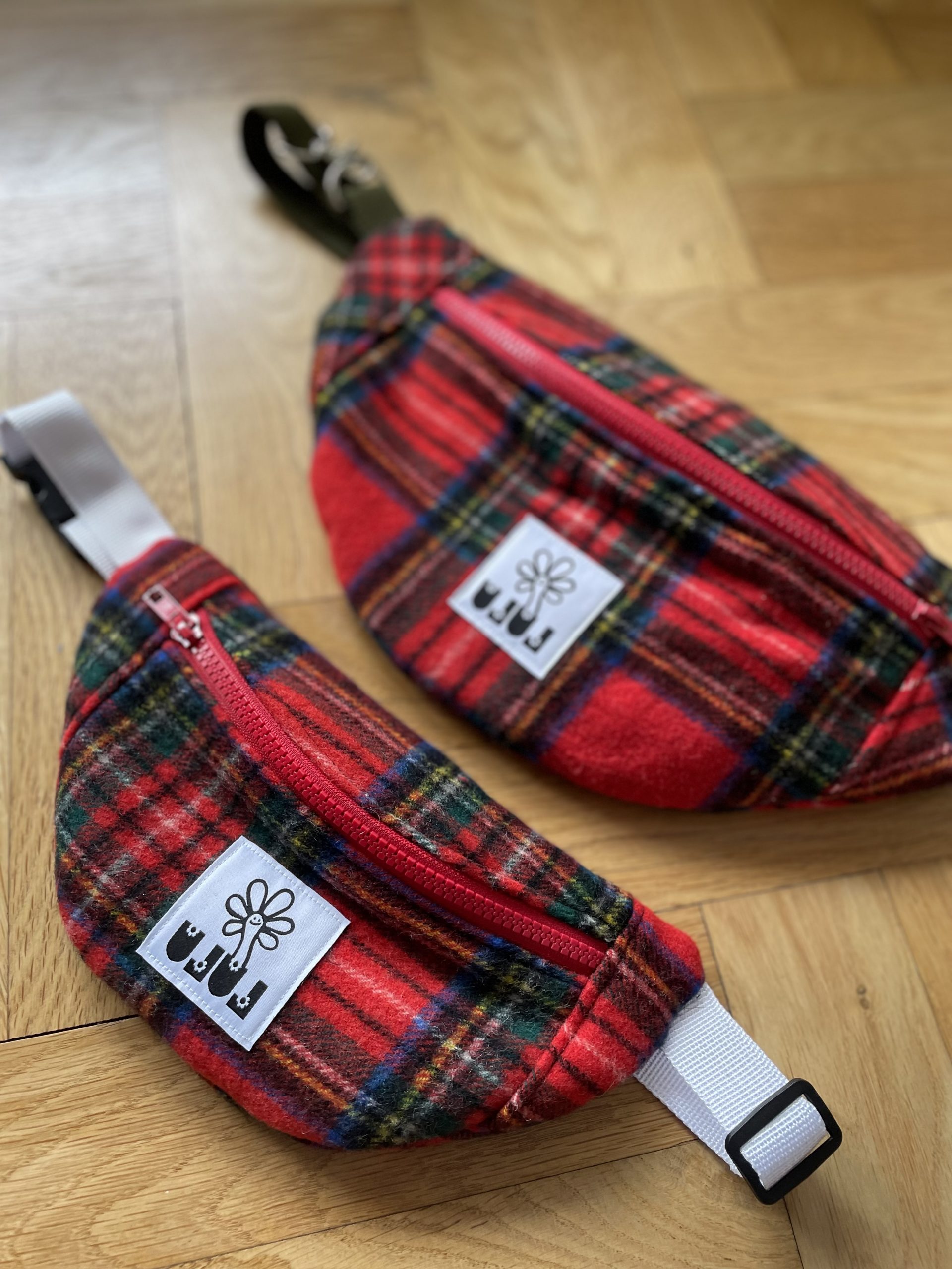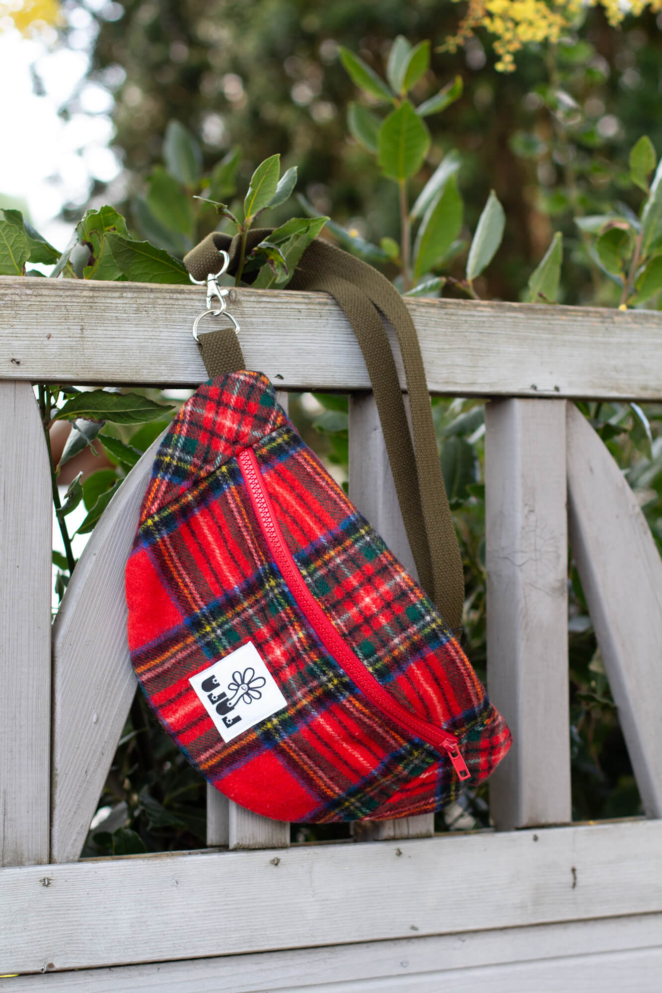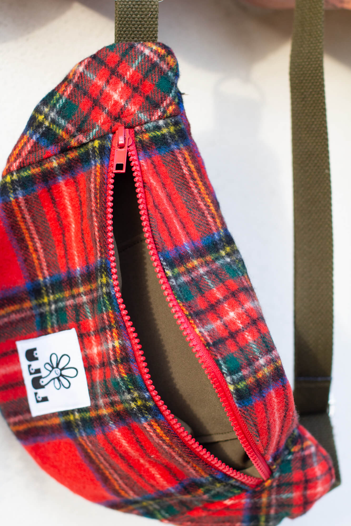 Sac banane tartan écossais rouge en modèle basique. Tissu extérieur en laine, intérieur kaki satiné. Petite poche intérieure.