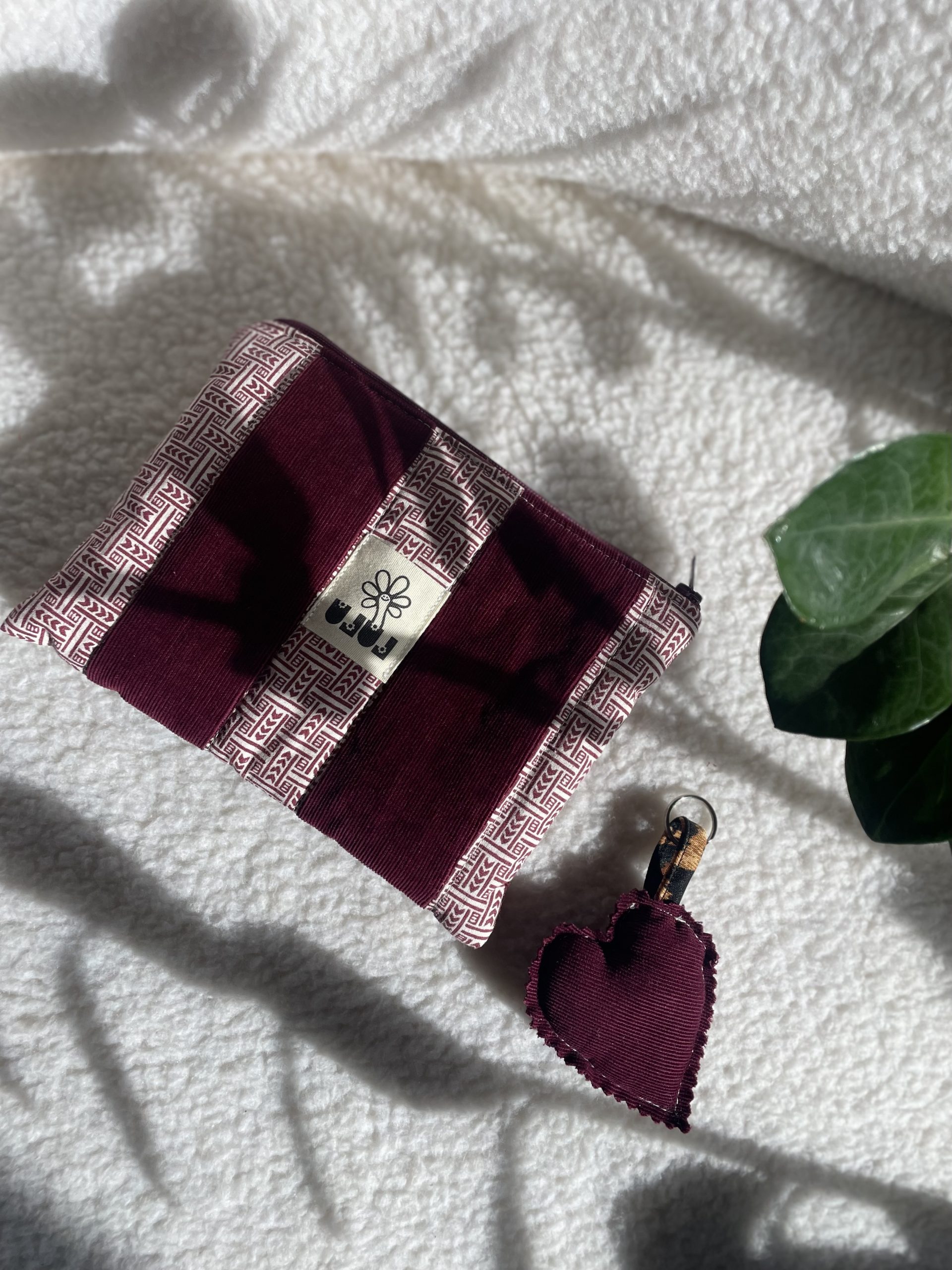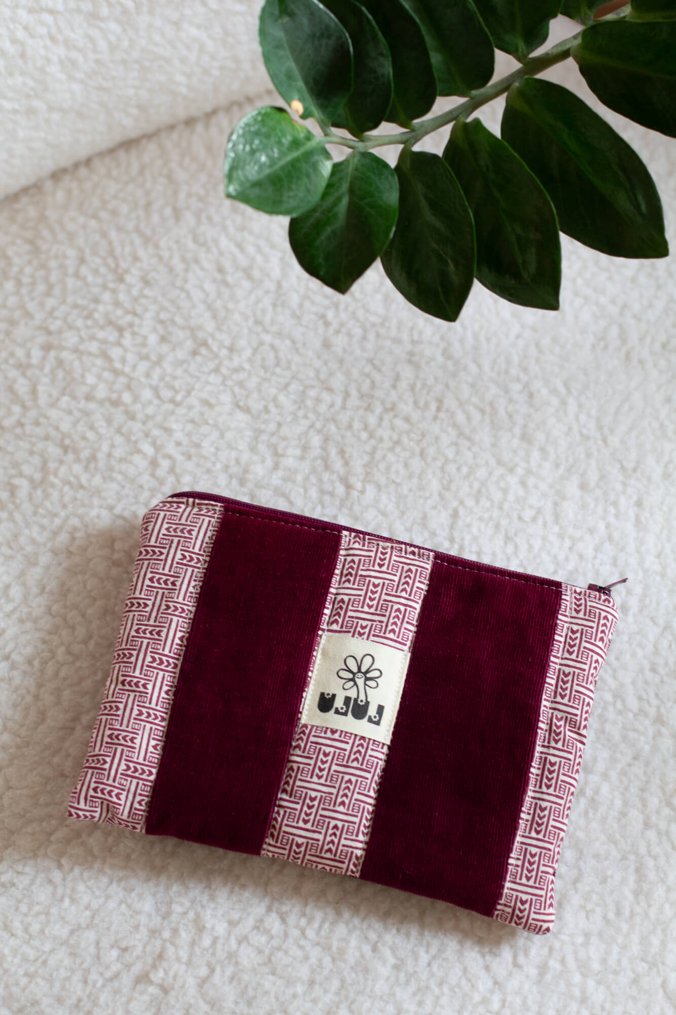 Pochette matelassée moyen format. Patchwork de chutes de tissus, intérieur marron.