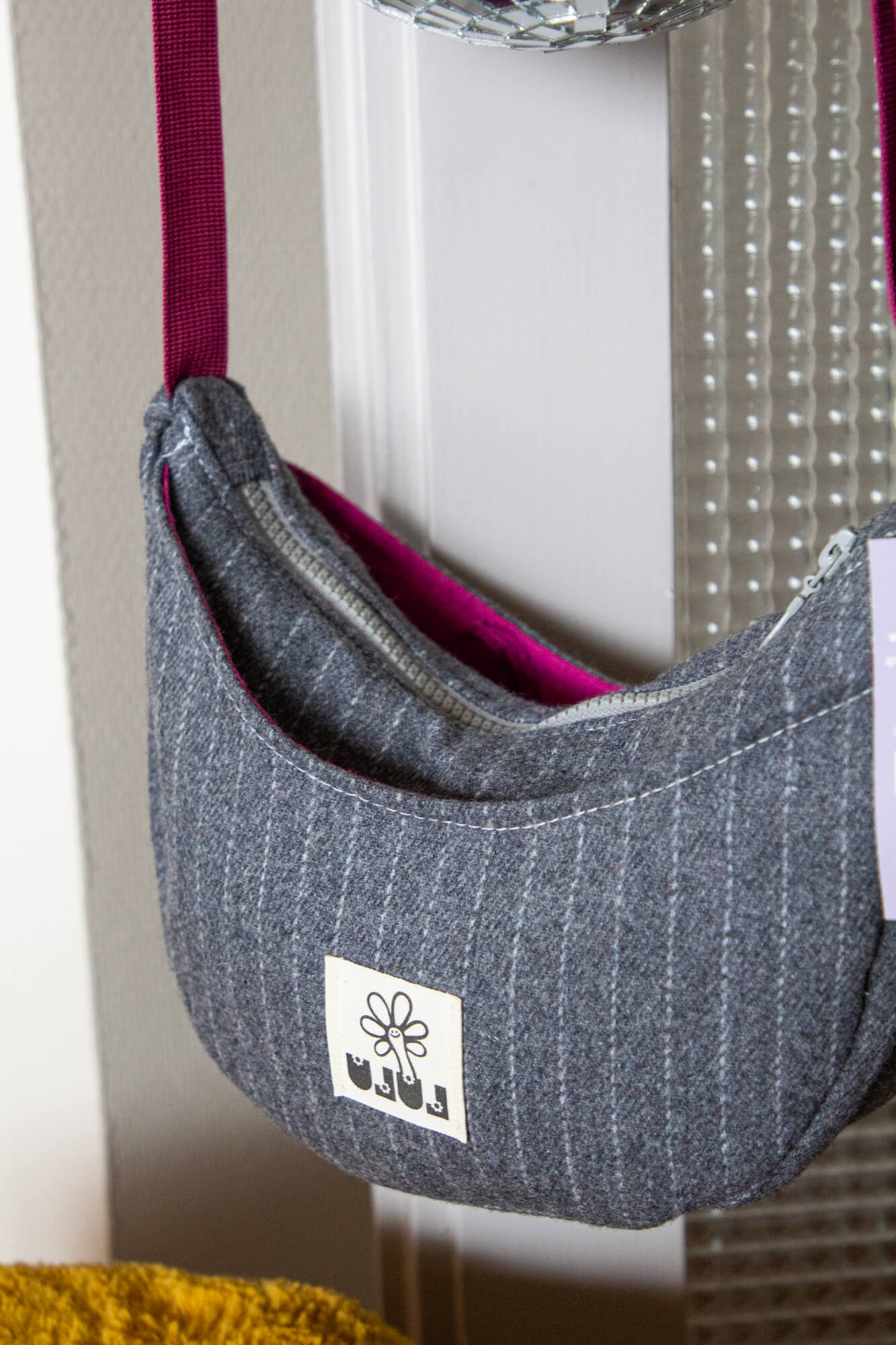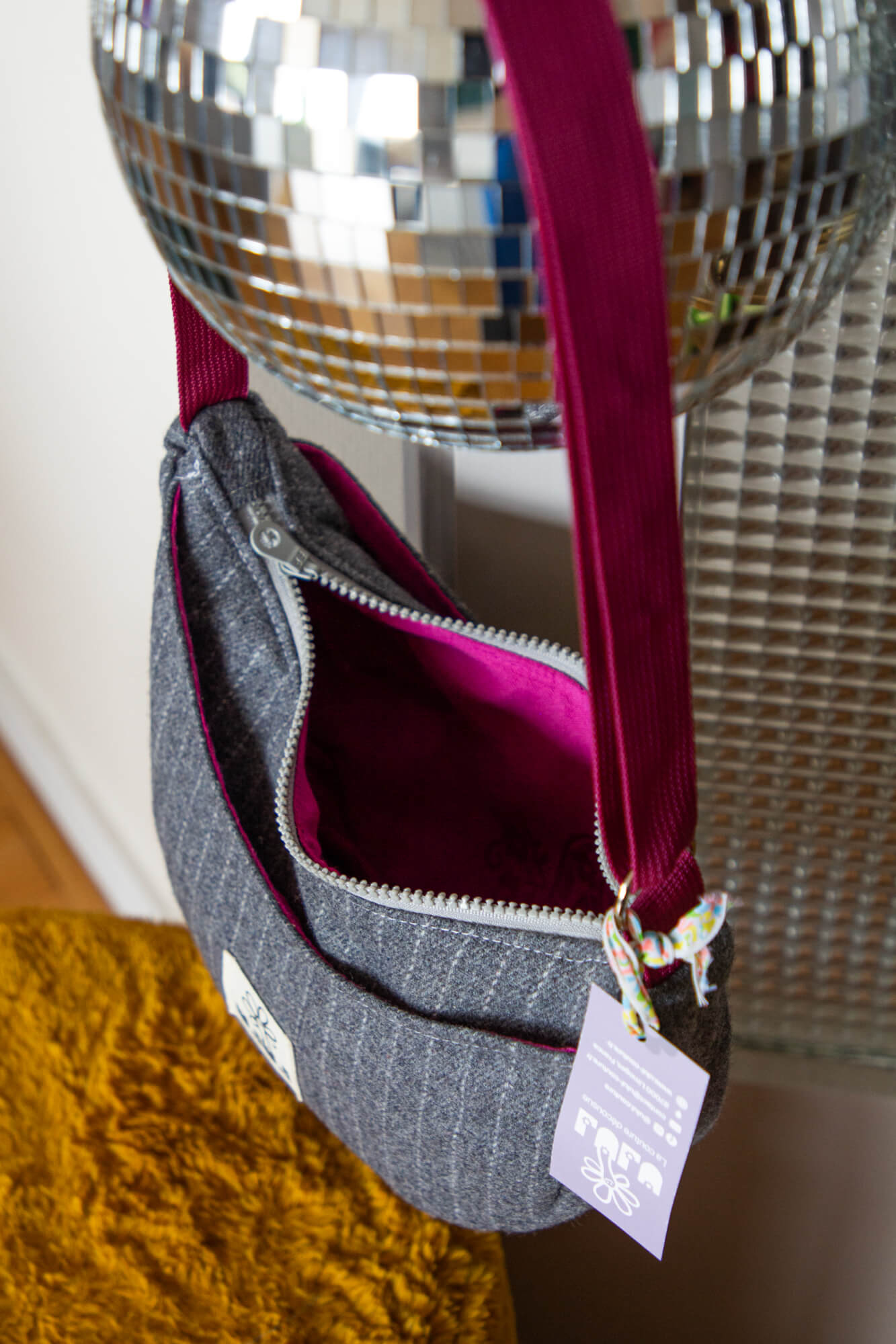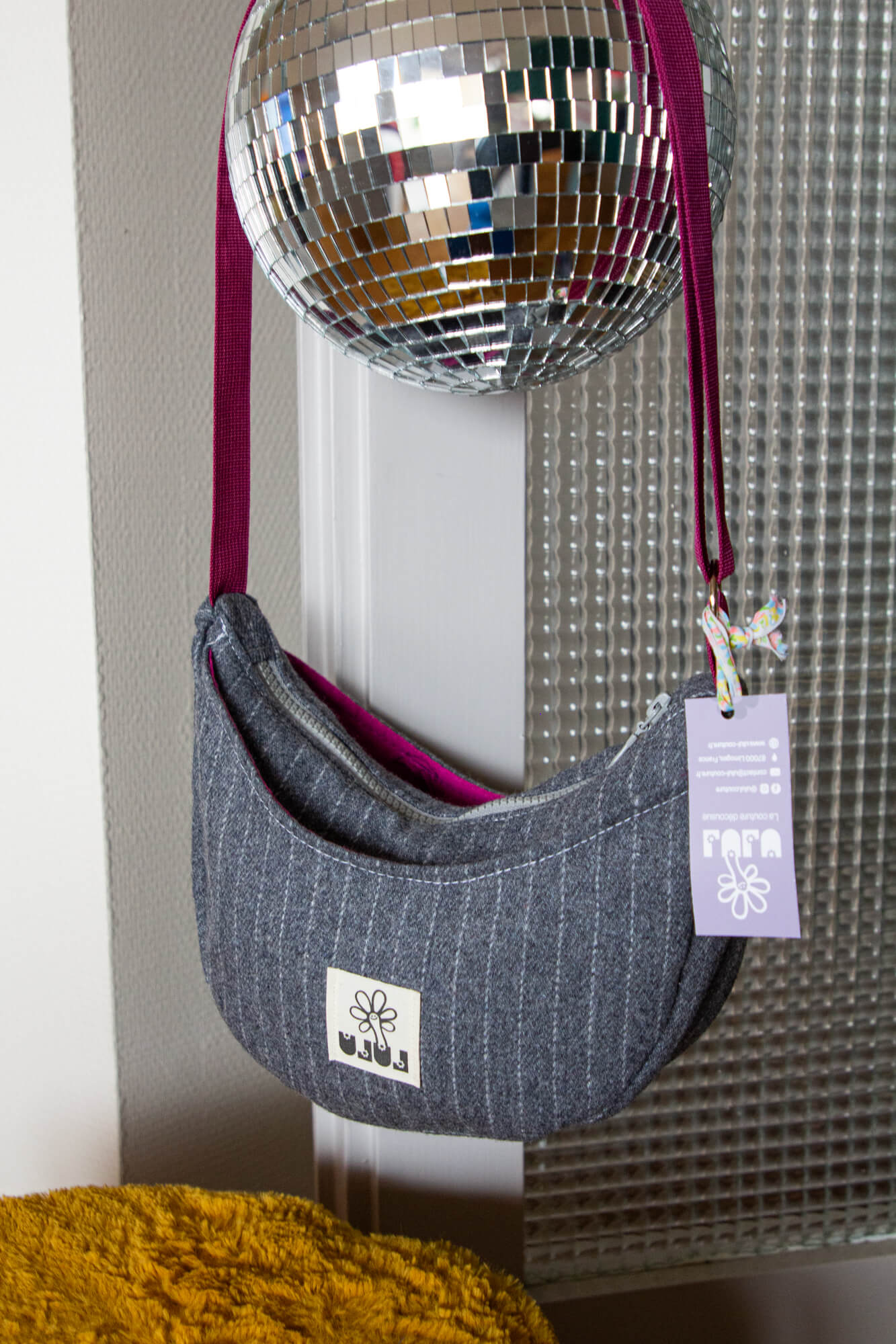 Sac croissant à 3 poches (2 externes à boutons pression et 1 interne à fermeture éclair). Tissu gris à rayures blanches et intérieur violet fuchsia.