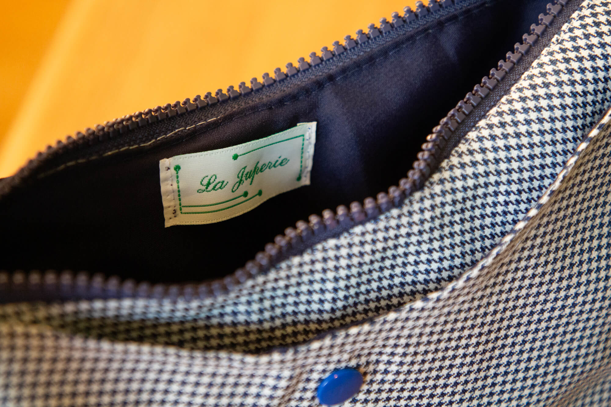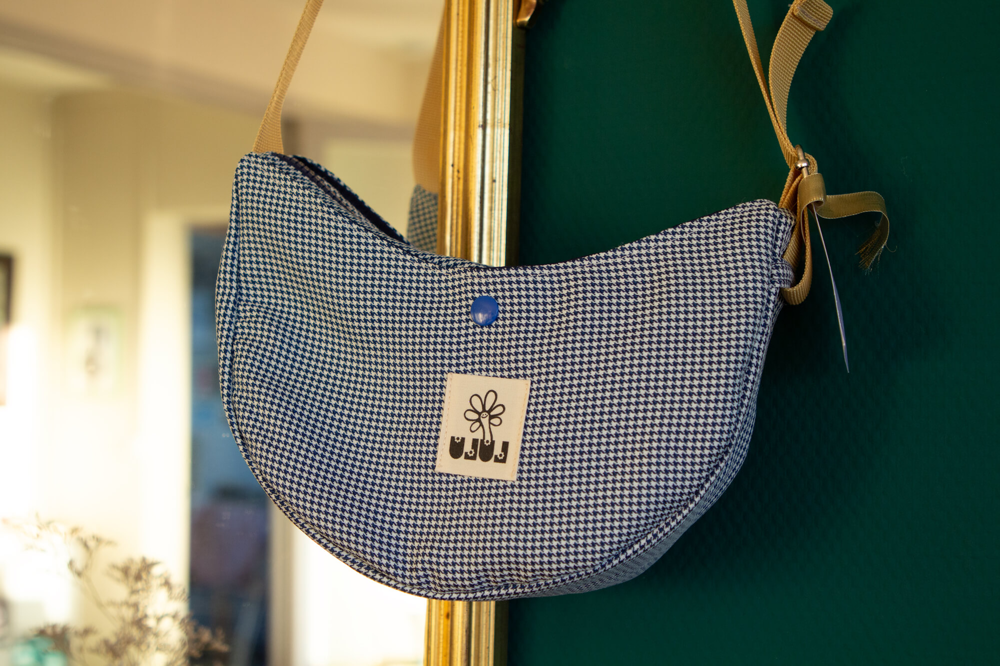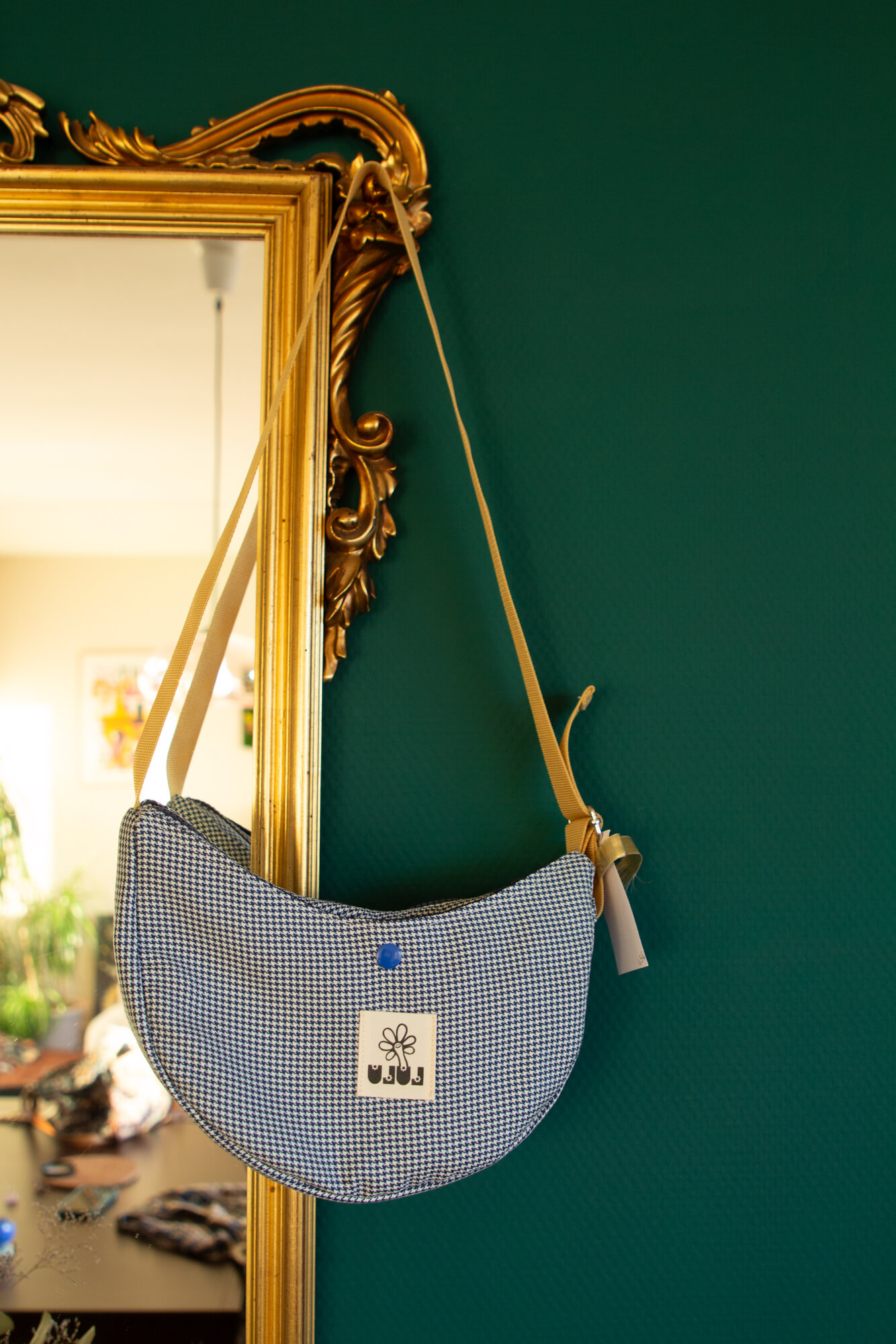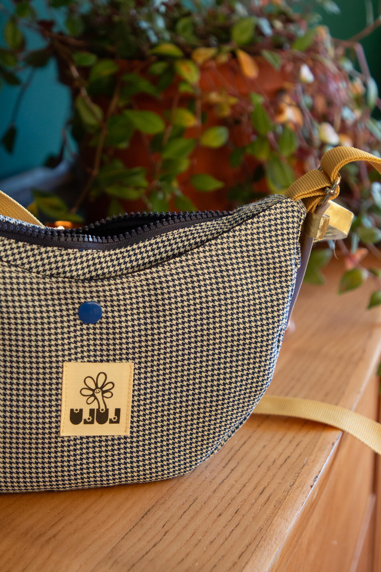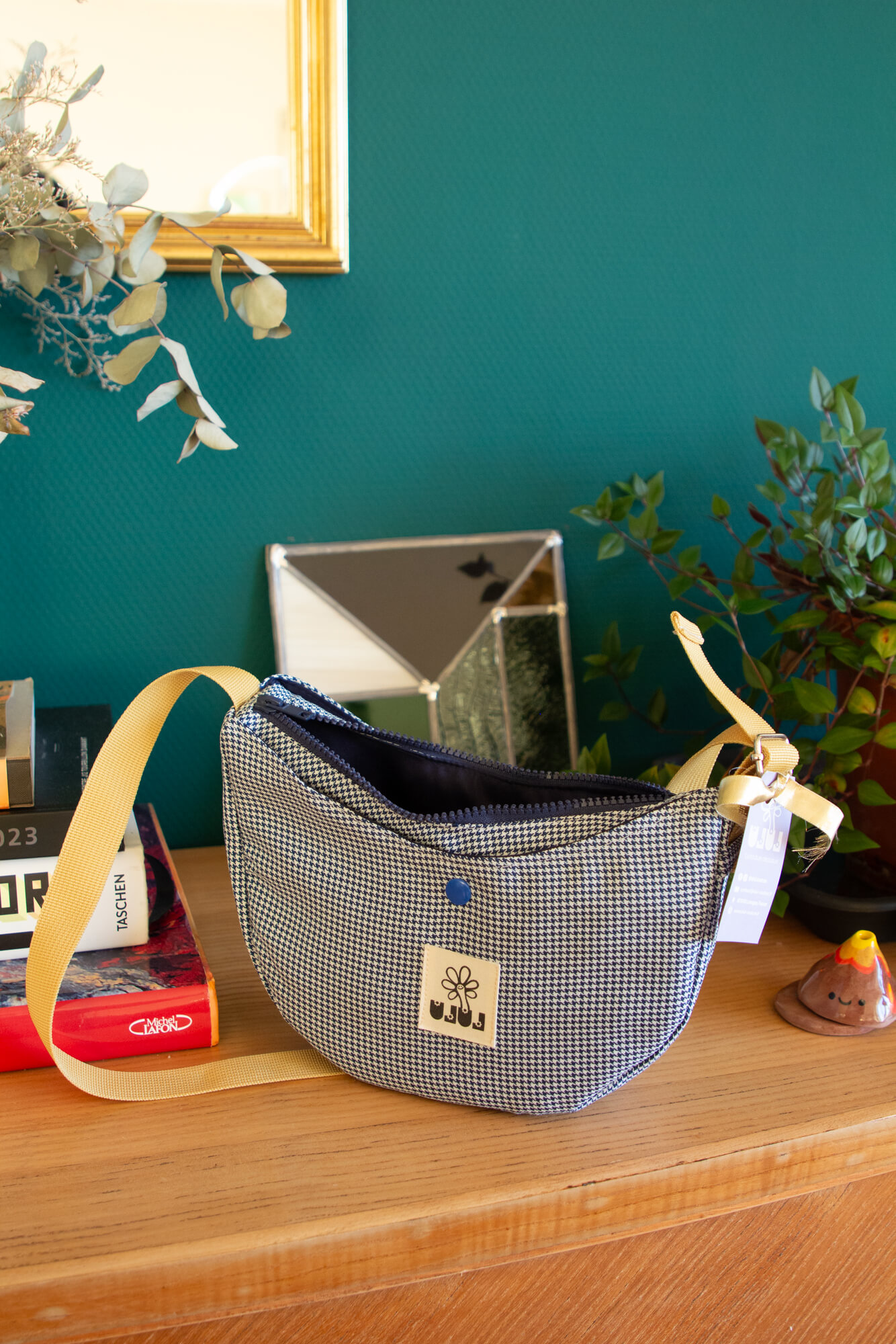 Sac croissant à 3 poches (2 externes à boutons pression et 1 interne à fermeture éclair). Tissus pied-de-poule et intérieur bleu foncé uni.