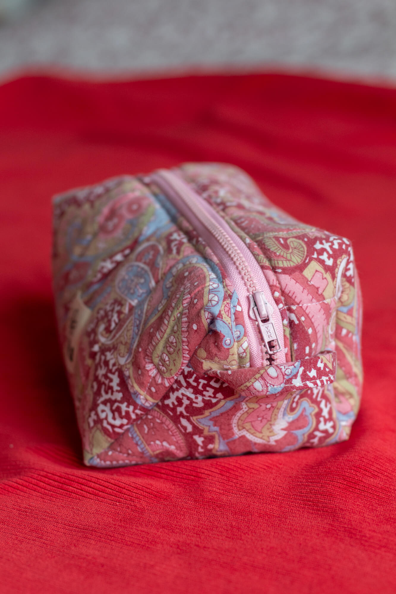 Trousse matelassée grand format avec défaut. Tissu à motif fleurs, intérieur blanc uni. Elle a un côté asymétrique, une erreur de fabrication de ma part !