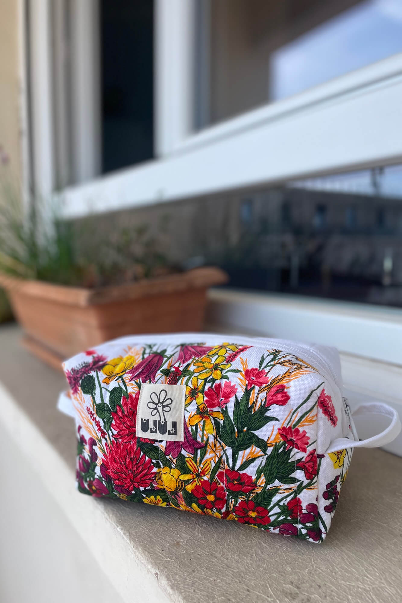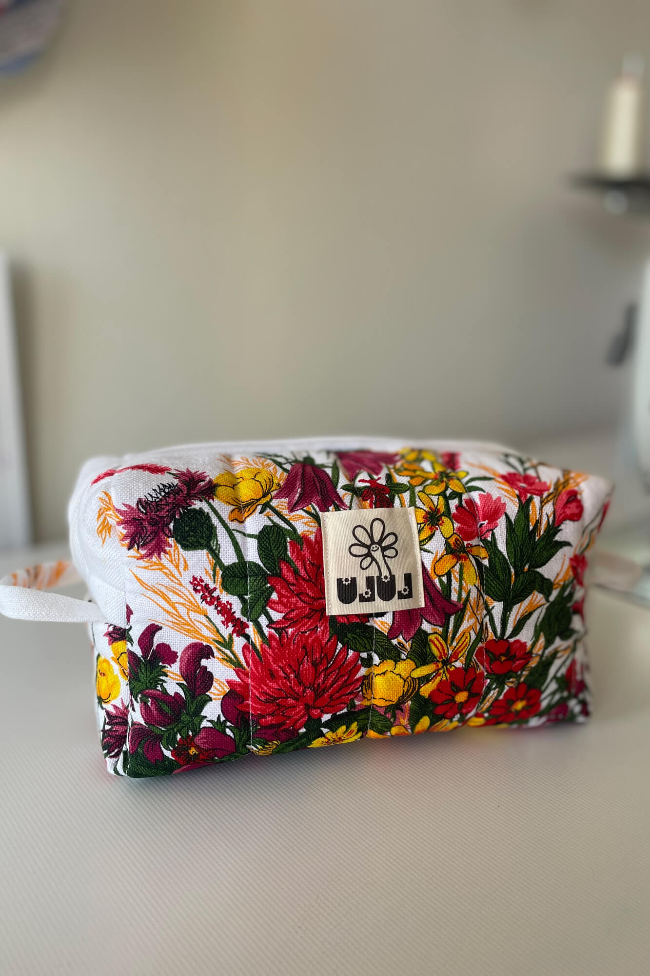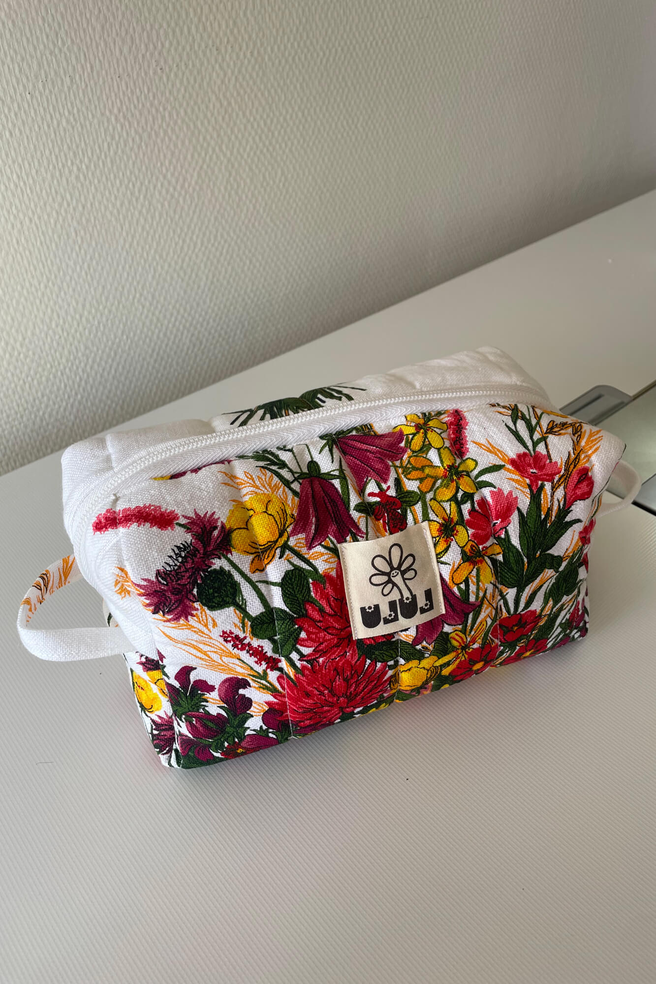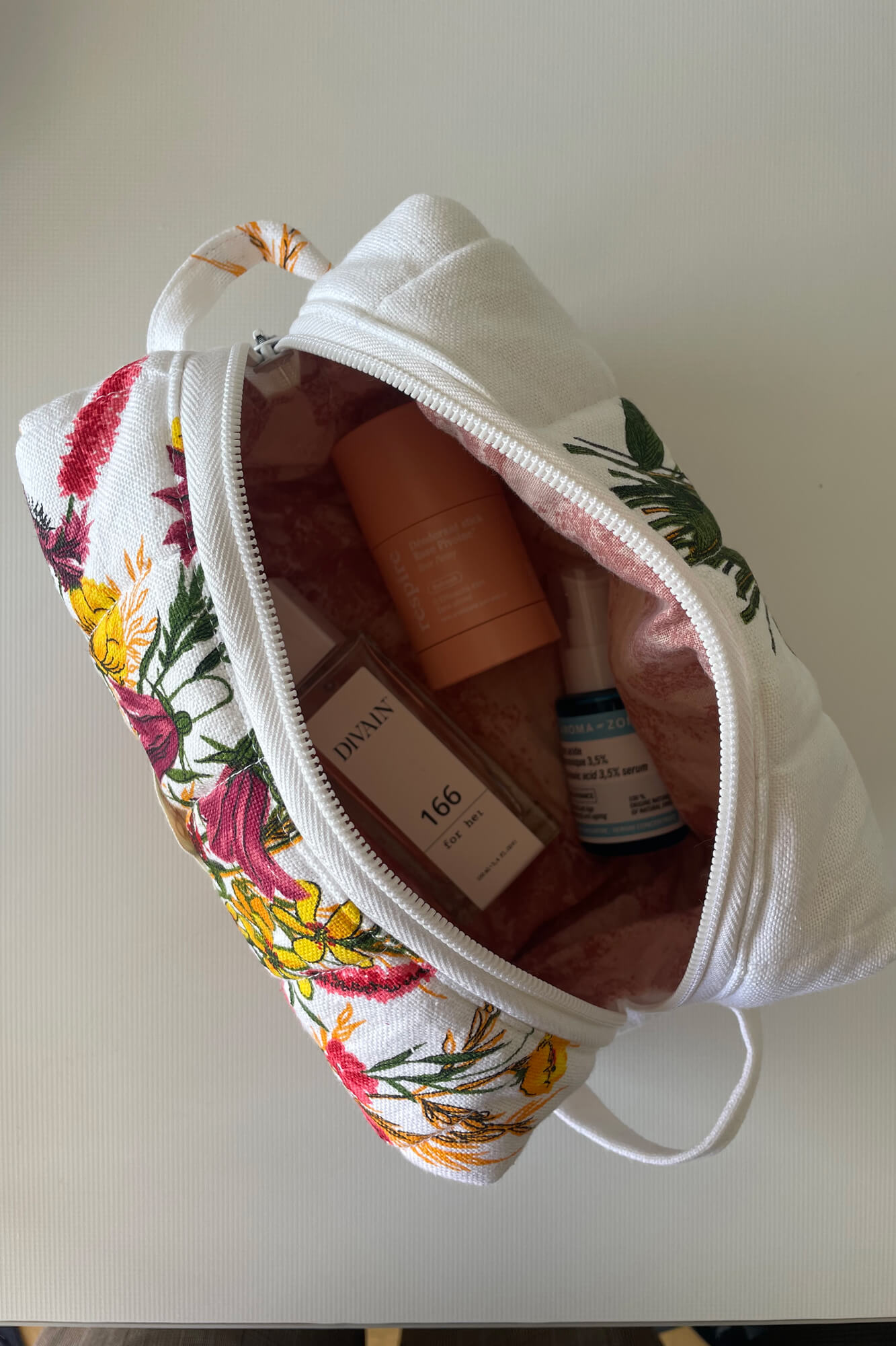 Trousse matelassée grand format. Tissu avec un bouquet de fleurs, intérieur rose.