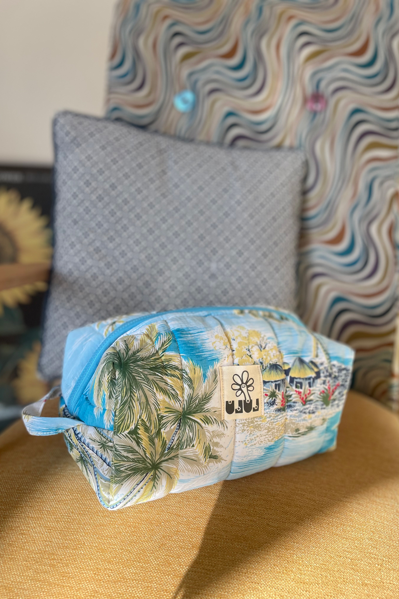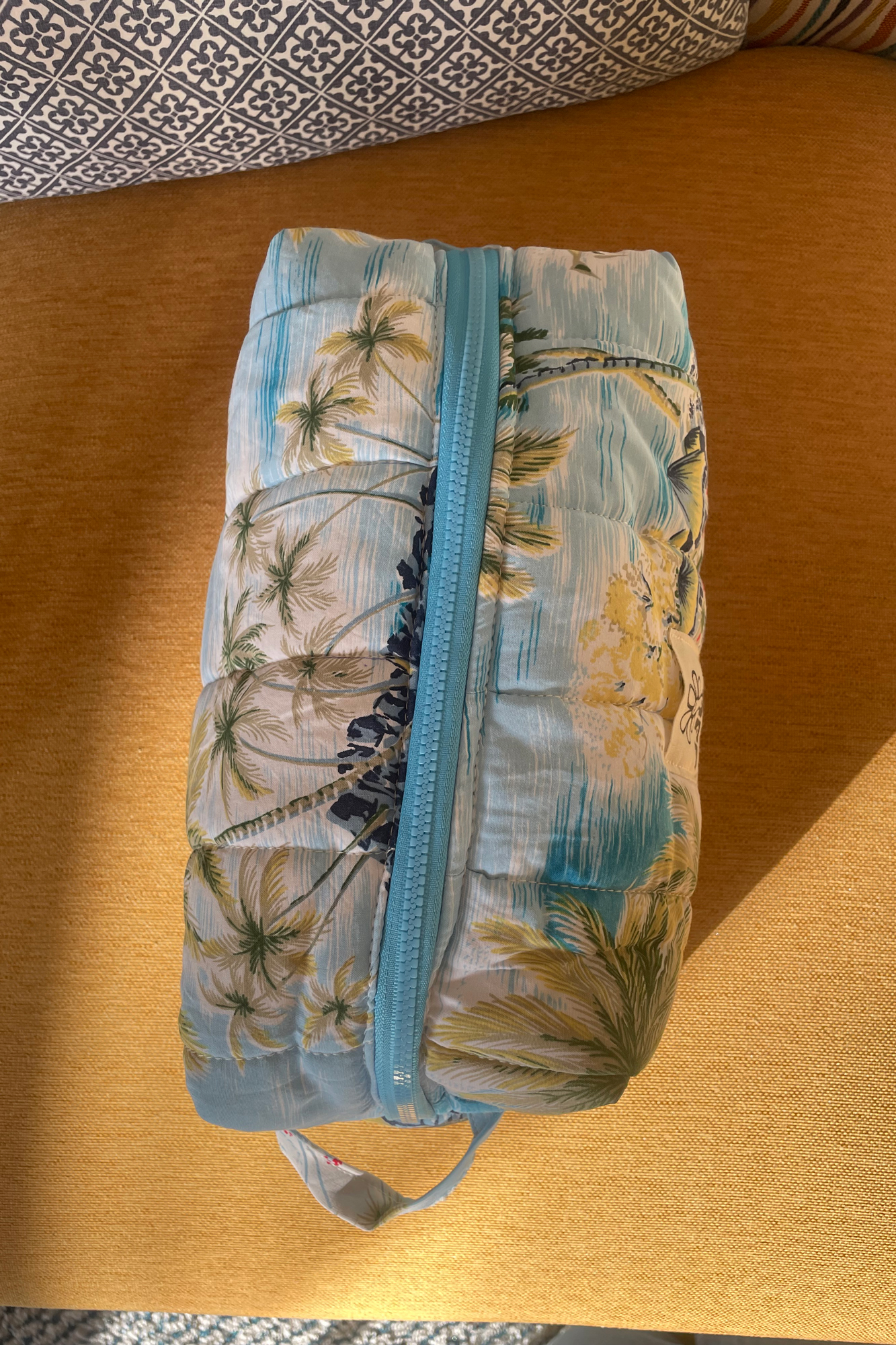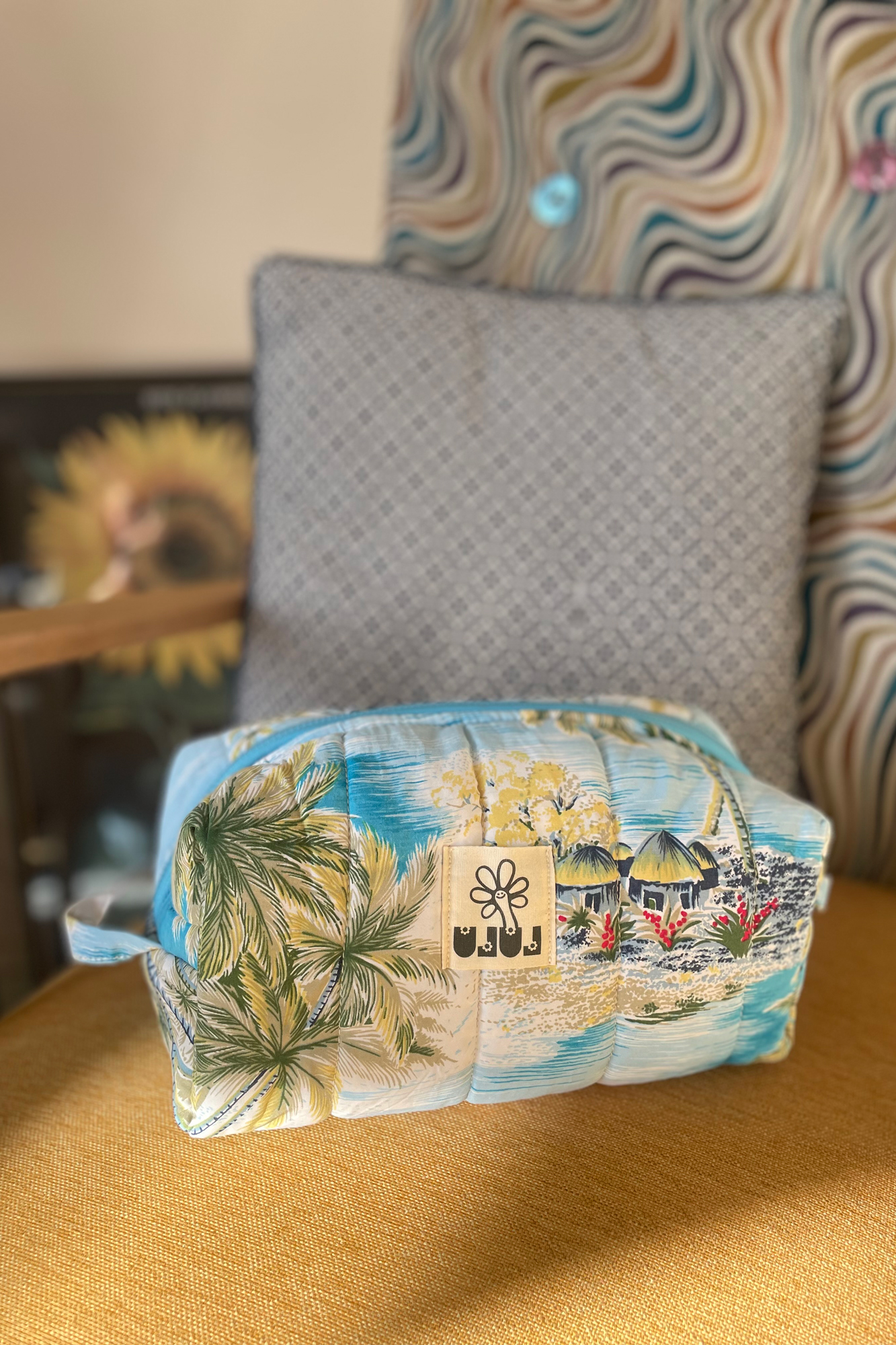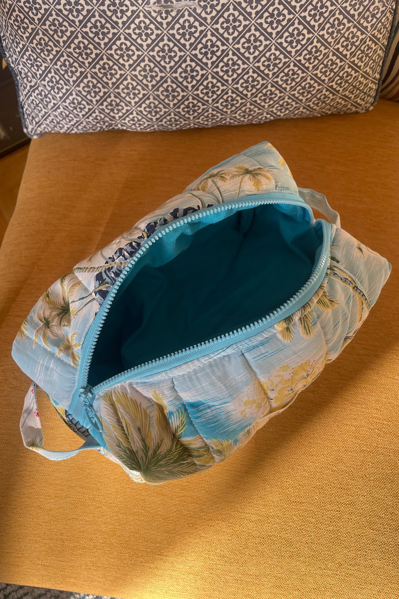 Trousse matelassée grand format. Tissu à motif hawaïen (palmier et huttes), intérieur bleu turquoise.