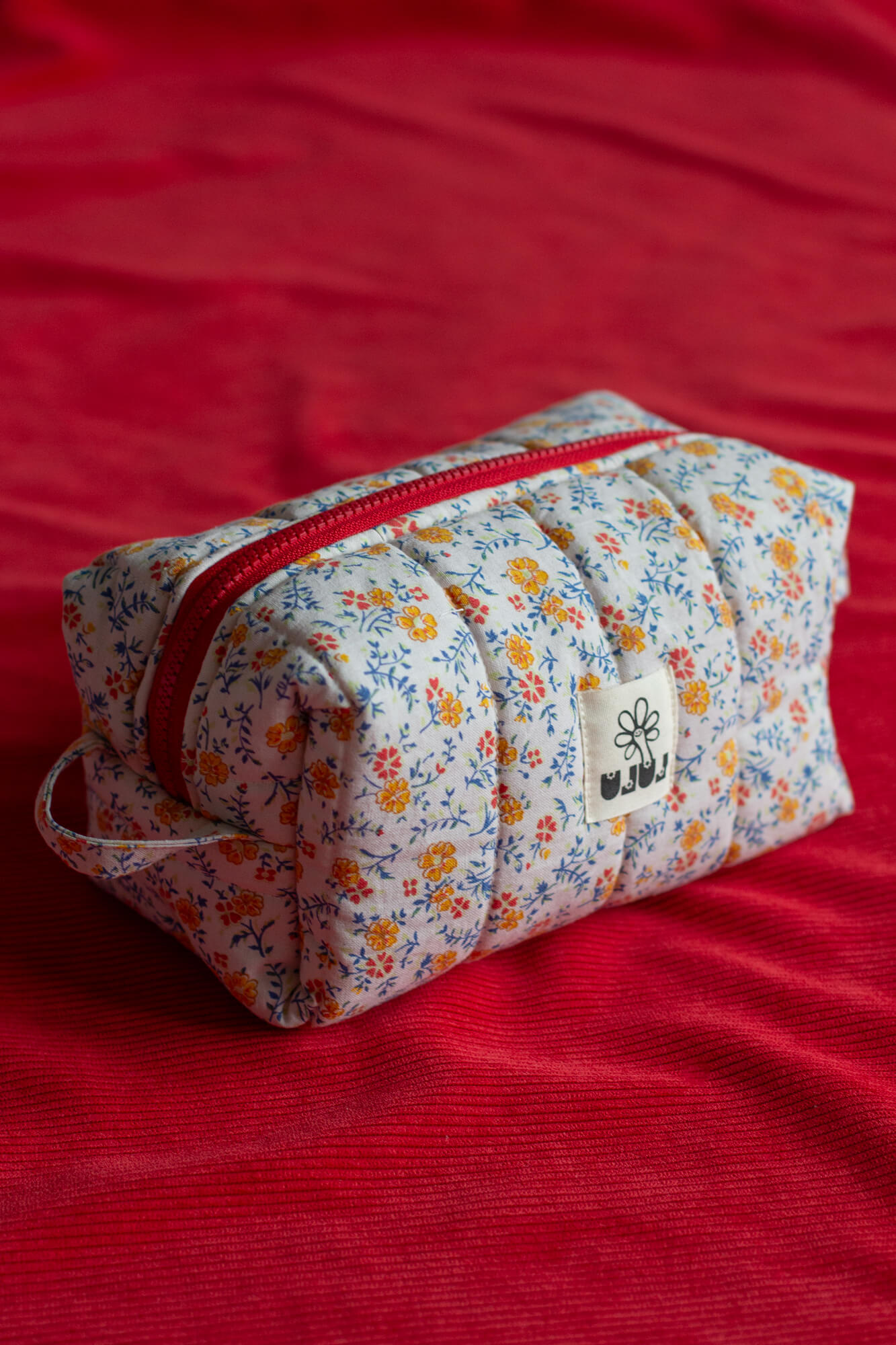 Trousse matelassée grand format. Tissu à motif fleurs, intérieur rouge uni.